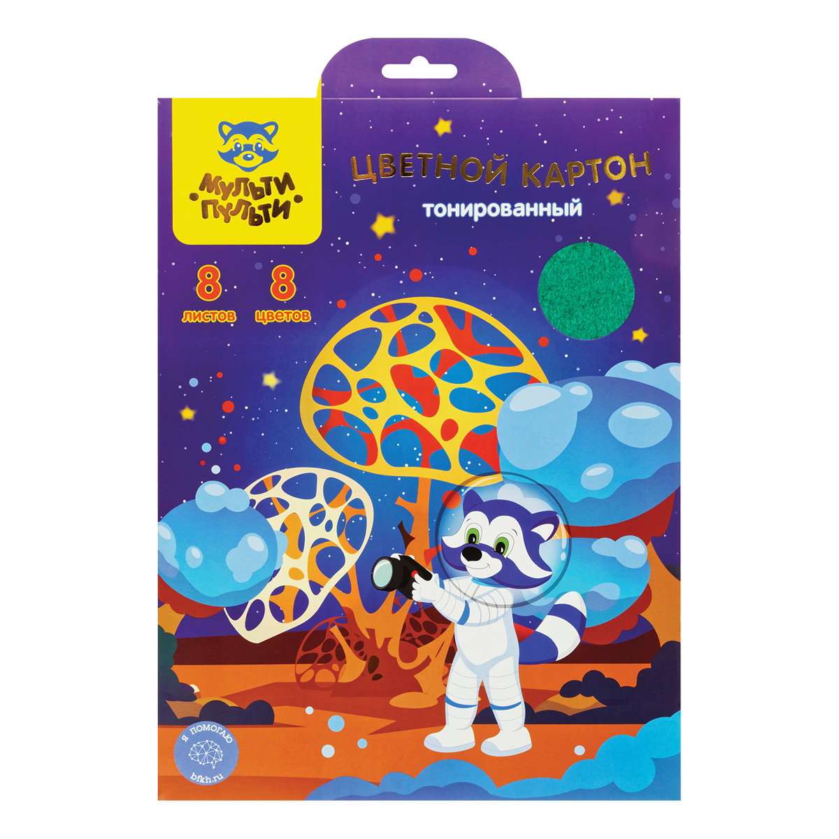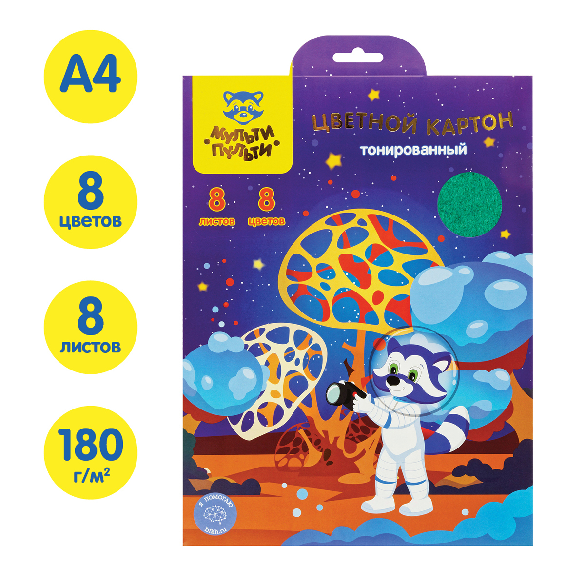 В наборе цветного картона «Мульти-Пульти» используется высококачественный тонированный в массе картон. Тонированный в массе картон - материал, который сделан из прокрашенной целлюлозы и имеет единый цвет в том числе на срезе и сгибах. Подходит для особых поделок, где нужны очень качественные материалы, оформления поздравительных открыток, альбомов. Размер: 200*285 мм. Плотность: 180 г/м2. Набор включает в себя 8 листов картона 8 насыщенных цветов. Для детей старше 3-х лет.
