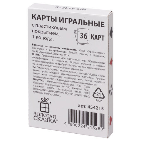 ОписаниеИгральные карты ЗОЛОТАЯ СКАЗКА подойдут для карточных игр, фокусов и раскладывания простых пасьянсов.Колода состоит из 36 карт размером 8,5 х 5,5 см. Карты защищены влагоустойчивым пластиковым покрытием.Приобретите качественные игральные карты ЗОЛОТАЯ СКАЗКА для ваших любимых карточных игр!