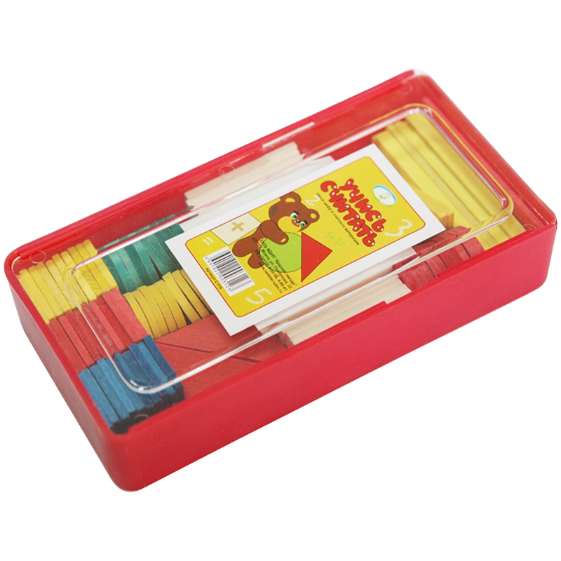 Набор состоит из следующих деталей: Счётные палочки - 20 штук, Круги - 30 штук, Квадраты - 30 штук, Треугольники равносторонние - 10 штук, Треугольники с прямым углом и углами 30° и 60° - 10 штук, Пластины с математическими знаками + - = > < и цифрами от 0 до 9 - 28 штук