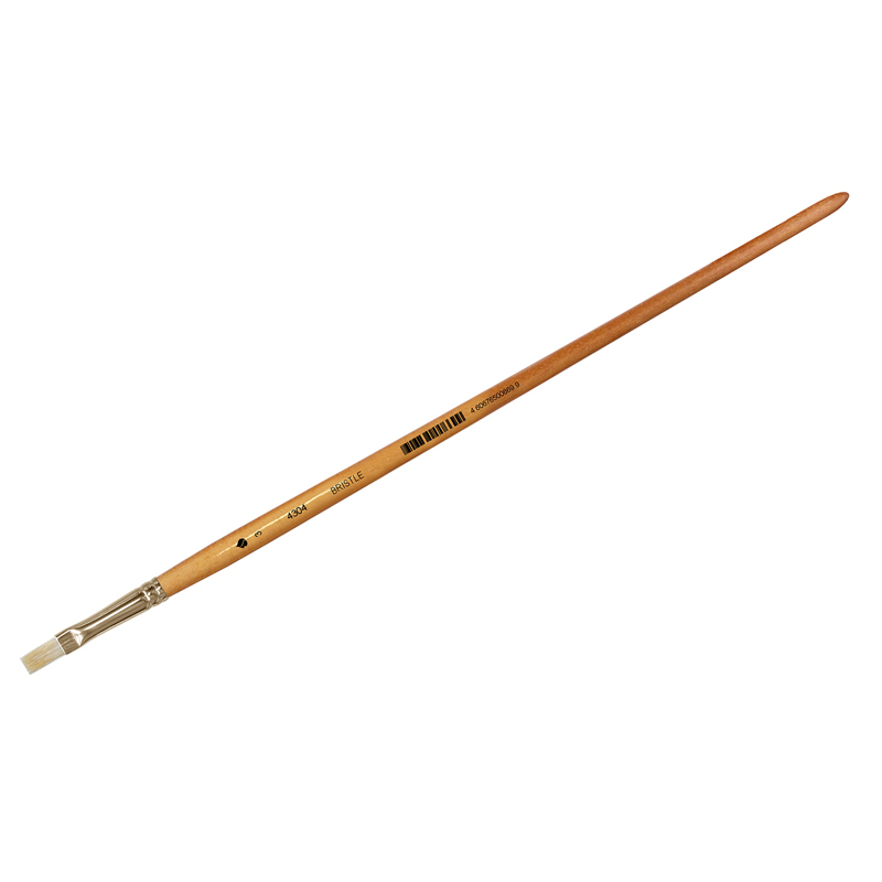 Кисть из щетины отбеленной. Профессиональная серия. Форма рабочей части: плоская. Обойма: цельнотянутая алюминиевая. Ручка удлиненная деревянная с декоративно-защитным покрытием.
