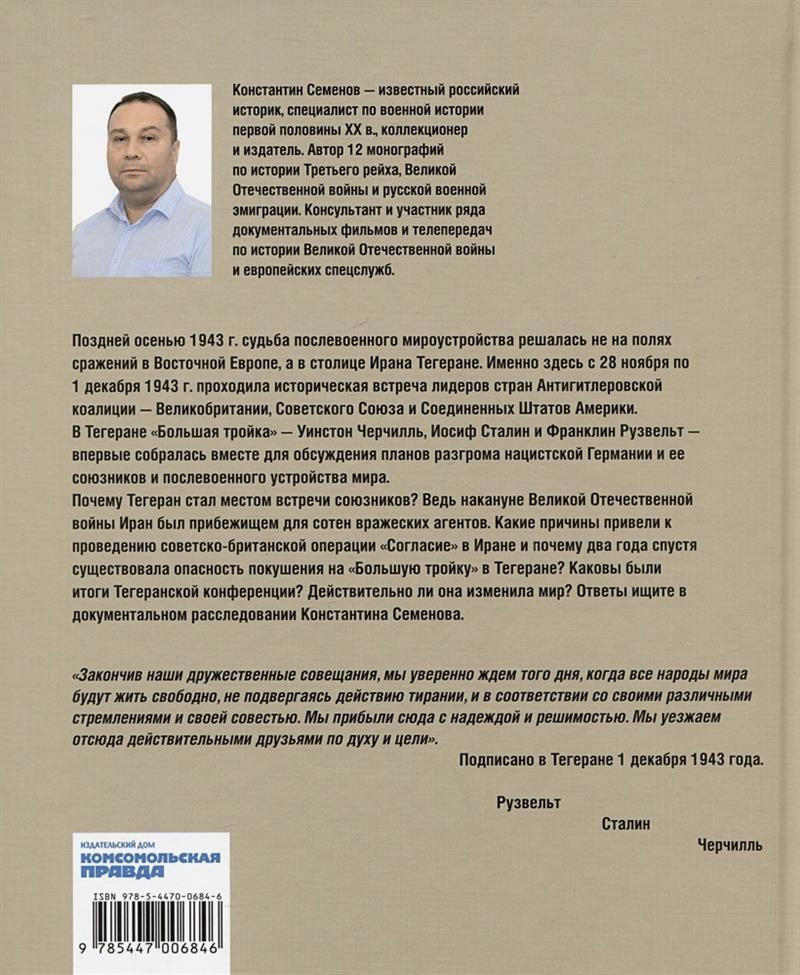 Поздней осенью 1943 г. Судьба послевоенного мироустройства решалась не на полях сражений в Восточной Европе, а в столице Ирана — Тегеране. Именно здесь, в период 28 ноября — 1 декабря 1943 г. Состоялась историческая встреча лидеров стран Антигитлеровской коалиции — Великобритании, Советского Союза и Соединенных штатов Америки. В Тегеране Большая тройка — Уинстон Черчилль, Иосиф Сталин и Франклин Рузвельт, впервые собралась вместе для обсуждения планов разгрома нацистской Германии и ее союзников и послевоенного устройства мира. Почему Тегеран стал местом встречи союзников? Ведь накануне Великой Отечественной войны Иран стал прибежищем для сотен вражеских агентов. Какие причины привели кпроведению советско-британской операции «Согласие» в Иране и почему два года спустя существовала опасность покушения на Большую тройку в Тегеране? Каковы были итоги Тегеранской конференции? Действительно ли она изменила мир? Ответы ищите в документальном расследовании Константина Семенова.
