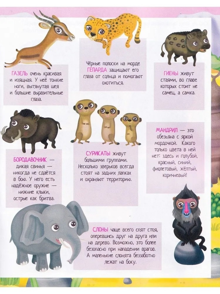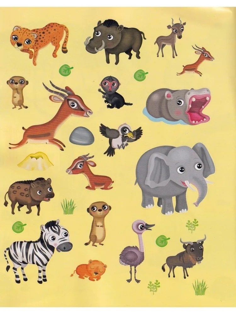 С помощью этой книжки ребёнок узнает много интересного о животных саванны. Выполняя игровые задания, он будет искать отличия в рисунках, проходить по запутанным лабиринтам, дорисовывать и раскрашивать картинки. Книга содержит 50 наклеек. На специальном развороте их можно расположить где угодно и создать свою неповторимую картину. Книжку удобно брать в дорогу или на отдых.