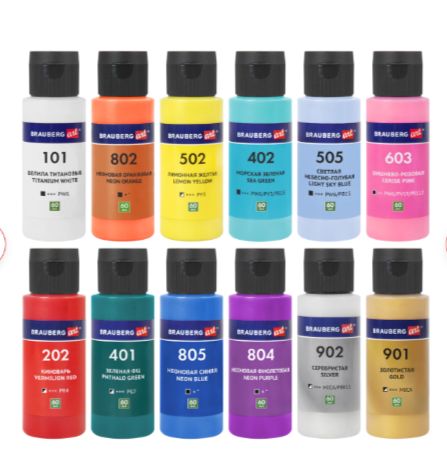 Жидкие акриловые краски разработаны по особой формуле, благодаря которой цвета практически не смешиваются между собой – это позволяет добиться причудливых изгибов с контрастными переходами. Разливая краски по поверхности в различных пропорциях, получают уникальный рисунок. Краски ярких и насыщенных цветов подходят для работы на грунтованном холсте, деревянной панели, стекле и других твердых основах, устойчивых к воздействию влаги. Не требуют разбавления водой, полностью готовы к использованию. Не токсичны и не имеют неприятного резкого запаха. Обладают высокой укрывистостью и светостойкостью. Краски во флаконах объемом 60 мл с удобным дозировочным клапаном поставляются в картонной коробке. В наборе 12 цветов: - киноварь (202); - неоновая оранжевая (802); - лимонная желтая (502); - зеленая ФЦ (401); - светлая небесно-голубая (505); - неоновая синяя (805); - неоновая фиолетовая (804); - морская зеленая (402); - вишнево-розовая (603); - золотистая (901); - серебристая (902); - белила титановые (101). Художественные краски, представленные широкой цветовой гаммой, пригодятся как канцтовары школьникам, студентам, участникам мастер-классов, ученикам художественных школ, студий и училищ, живописных мастерских. Отлично подойдут для работы дома или на пленэре. Эти краски используют любители для хобби, которые стремятся достичь такой же славы как Пабло Пикассо (Pablo Picasso), Казимир Малевич, Марк Шагал, Клод Моне (Claude Monet), Рембрандт (Rembrandt), Сальвадор Дали (Salvador Dali), Энди Уорхол (Andy Warhol), Андрей Рублев, Фрида Кало (Frida Kahlo), Винсент Ван Гог (Vincent van Gogh), Тициан (Tician), Анри Матисс (Henri Matisse), Леонардо да Винчи (Leonardo da Vinci) и другие популярные художники.