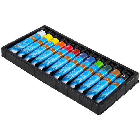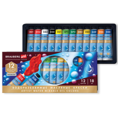 Водорастворимые масляные краски обладают всеми свойствами классических масляных красок, за исключением одного - они разбавляются водой. Благодаря этой особенности кисти легко мыть, не нужно использовать едкие растворители, резкий запах которых доставляет неудобства в процессе работы. Вязкая текстура краски обеспечивает сохранение ее эластичности в течение длительного времени. Изготовлена на основе высококачественных пигментов. После высыхания сохраняет яркий и насыщенный цвет с характерным глянцевым блеском. Все цвета не только прекрасно смешиваются между собой, но и совместимы с классическими масляными красками. Краски поставляются в картонной коробке, в тубах по 18 мл. В наборе 12 ярких и насыщенных цветов: - белила титановые (044); - лимонная желтая (021); - желтая средняя (023); - оранжевая (026); - кадмий красный (014); - красная темная (001); - голубая ФЦ (039); - кобальт синий (038); - салатовая (071); - зеленая ФЦ (072); - сиена жженая (082); - черная слоновая кость (058). Художественные краски, представленные широкой цветовой гаммой, пригодятся как канцтовары школьникам, студентам, участникам мастер-классов, ученикам художественных школ, студий и училищ, живописных мастерских. Отлично подойдут для работы дома или на пленэре. Эти краски используют любители для хобби, которые стремятся достичь такой же славы как Пабло Пикассо (Pablo Picasso), Казимир Малевич, Марк Шагал, Клод Моне (Claude Monet), Рембрандт (Rembrandt), Сальвадор Дали (Salvador Dali), Энди Уорхол (Andy Warhol), Андрей Рублев, Фрида Кало (Frida Kahlo), Винсент Ван Гог (Vincent van Gogh), Тициан (Tician), Анри Матисс (Henri Matisse), Леонардо да Винчи (Leonardo da Vinci) и другие популярные художники.