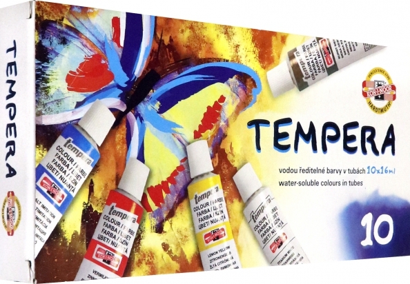 Темперные краски изготовлены из сильно размельченных неорганических и органических пигментов. Отличаются хорошей цветовой насыщенностью, светостойкостью и блеском. Быстро сохнут. Состав набора: белила цинковые (162601), лимонная желтая (162602), алая киноварь (162603), ализариновая красная темная (162604), кобальтовая синяя (162605), ультрамариновая синяя (162606), зеленая светлая (162607), зеленая темная (162608), жженая сиена коричневая (162609), сажа слоновой кости черная (162610).
