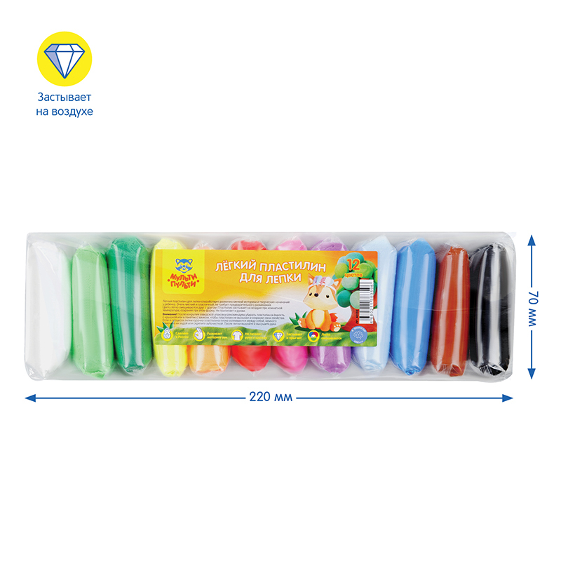 Воздушный (легкий) пластилин – это мягкий, очень пластичный и приятный материал, открывающий безграничные возможности в мир творчества. Лепка из легкого пластилина развивает мелкую моторику рук, фантазию и творческие способности. Пластилин очень мягкий, а цвета легко смешиваются между собой, создавая новые оттенки. Пластилин полностью высыхает на воздухе и сохраняет форму поделки. Чтобы неиспользованный пластилин не высох в состав набора входят пакетики с зип-локом, в которые можно убирать неиспользованный пластилин. Набор легкого пластилина Мульти-Пульти состоит из 12 цветов по 10 грамм. Пластилин не пачкает руки, одежду и мебель. Произведен и сертифицирован в России с использованием безопасных для здоровья детей красителей и компонентов.