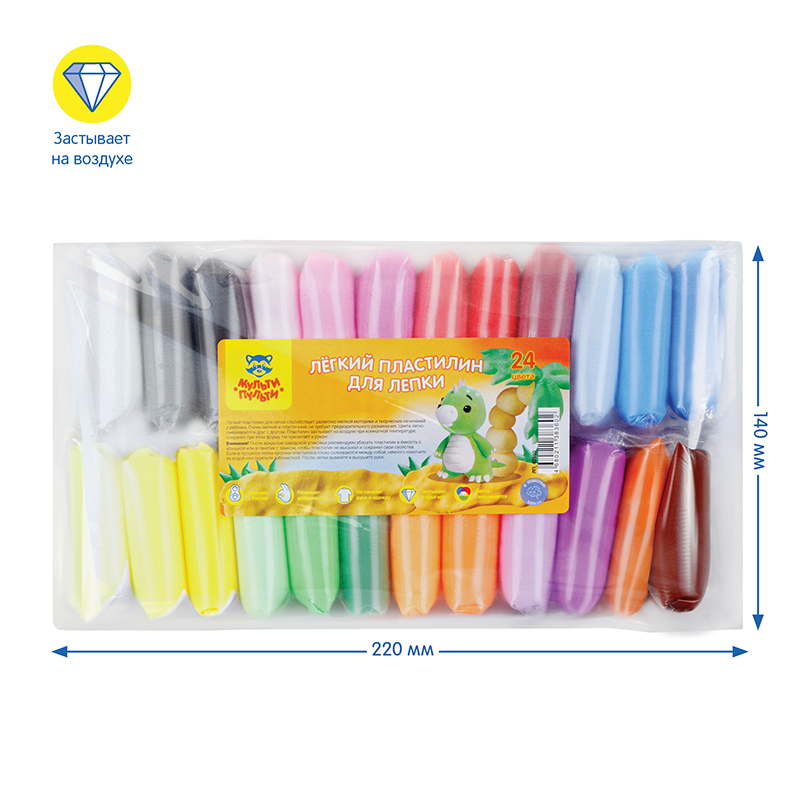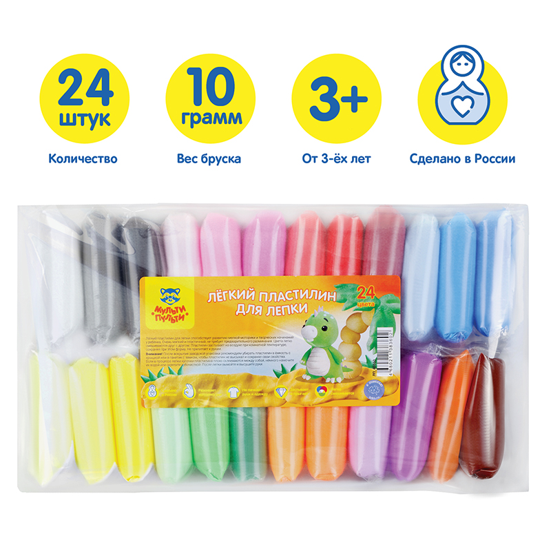 Воздушный (легкий) пластилин – это мягкий, очень пластичный и приятный материал, открывающий безграничные возможности в мир творчества. Лепка из легкого пластилина развивает мелкую моторику рук, фантазию и творческие способности. Пластилин очень мягкий, а цвета легко смешиваются между собой, создавая новые оттенки. Пластилин полностью высыхает на воздухе и сохраняет форму поделки. Чтобы неиспользованный пластилин не высох в состав набора входят пакетики с зип-локом, в которые можно убирать неиспользованный пластилин. Набор легкого пластилина Мульти-Пульти состоит из 24 цветов по 10 грамм. Пластилин не пачкает руки, одежду и мебель. Произведен и сертифицирован в России с использованием безопасных для здоровья детей красителей и компонентов.