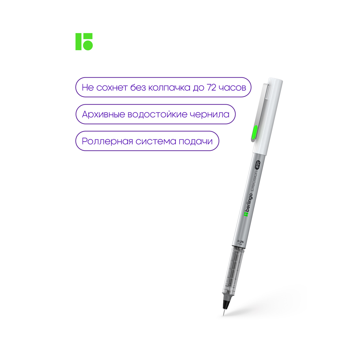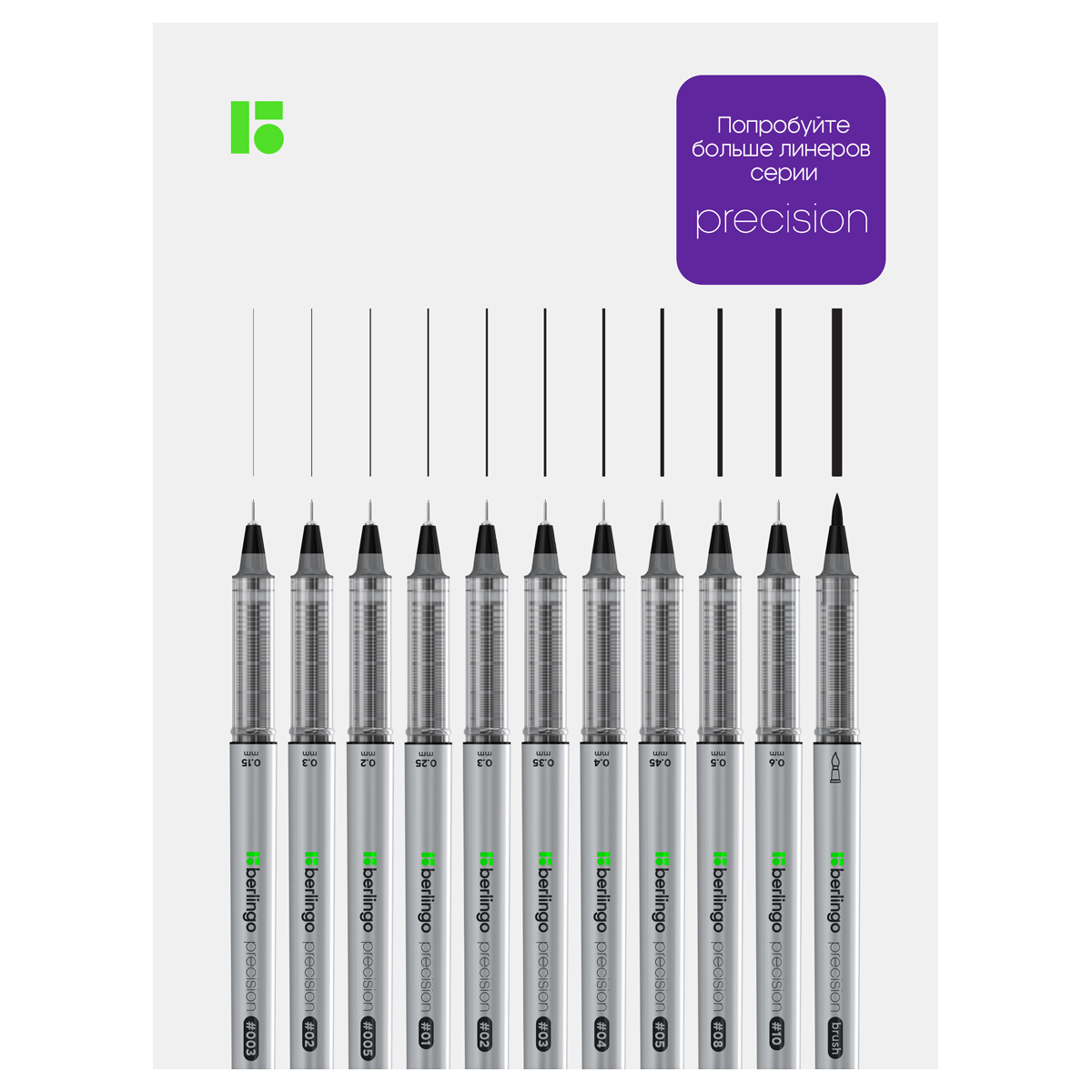 Пигментные линеры Precision – универсальный инструмент для чертежных и творческих работ с водостойкими чернилами на пигментной основе. Благодаря содержанию твердых, но очень мелких частиц пигмента краска остается на поверхности материала, а не впитывается внутрь. В результате, рисунок или надпись сделанный такими чернилами надолго сохраняет первоначальную яркость и насыщенность, не выцветает на солнце. Пигментные чернила не боятся влаги и могут сочетаться в работе и творчестве с большинством используемых материалов: акварелью, маслом, акрилом не теряя своих свойств. Ph-нейтральность позволяет им сохранять структуру и характеристики материала-основы. Уникальным свойством линеров серии Precision является «роллерная» подача чернил. Сложная система сообщающихся полостей с микронными проемами для подачи воздуха внутрь ручки гарантирует идеальную толщину линии письма. А хранение чернил в жидком виде – стабильность цвет от начала работы до последней капли. Профессиональный пишущий узел не только обеспечивает толщину линии с шагом 0,05 мм, но и позволяет ручке продолжить писать, даже если забыть закрыть ее колпачком на срок до 72 часов. Удобное окошко на обороте ручке позволит контролировать остаток чернил и заранее подготовить новый инструмент. А металлический клип – надежно закрепить ручку на скетчбуке, планшете или кармане.