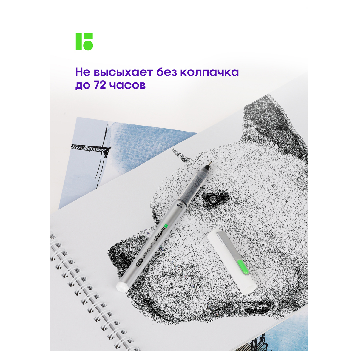 Пигментные линеры Precision – универсальный инструмент для чертежных и творческих работ с водостойкими чернилами на пигментной основе. Благодаря содержанию твердых, но очень мелких частиц пигмента краска остается на поверхности материала, а не впитывается внутрь. В результате, рисунок или надпись сделанный такими чернилами надолго сохраняет первоначальную яркость и насыщенность, не выцветает на солнце. Пигментные чернила не боятся влаги и могут сочетаться в работе и творчестве с большинством используемых материалов: акварелью, маслом, акрилом не теряя своих свойств. Ph-нейтральность позволяет им сохранять структуру и характеристики материала-основы. Уникальным свойством линеров серии Precision является «роллерная» подача чернил. Сложная система сообщающихся полостей с микронными проемами для подачи воздуха внутрь ручки гарантирует идеальную толщину линии письма. А хранение чернил в жидком виде – стабильность цвет от начала работы до последней капли. Профессиональный пишущий узел не только обеспечивает толщину линии с шагом 0,05 мм, но и позволяет ручке продолжить писать, даже если забыть закрыть ее колпачком на срок до 72 часов. Удобное окошко на обороте ручке позволит контролировать остаток чернил и заранее подготовить новый инструмент. А металлический клип – надежно закрепить ручку на скетчбуке, планшете или кармане.