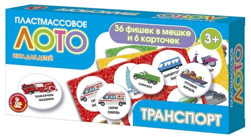 Лото пластиковое "Транспорт". Состав: картонные карточки-6 шт (14,5х9 см), фишки пластмассовые-36 шт (диаметр-4 см, толщина-0,3 см), мешочек из ткани для фишек-1 шт (30х18 см). Для 1-6 игроков. Лото знакомит с основными видами транспорта, а также развивает память, внимательность и навыки обобщения.
