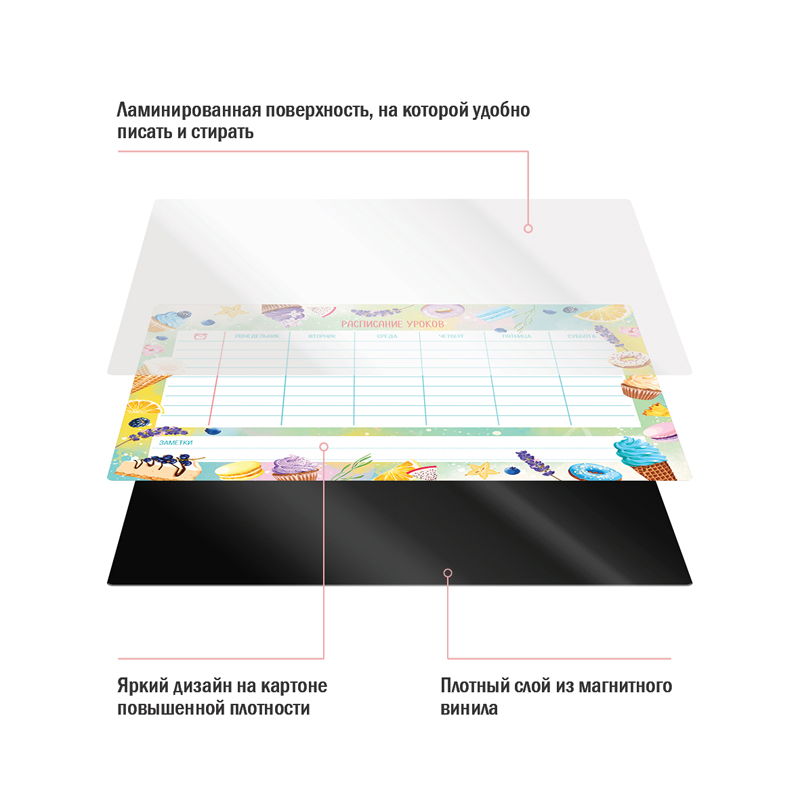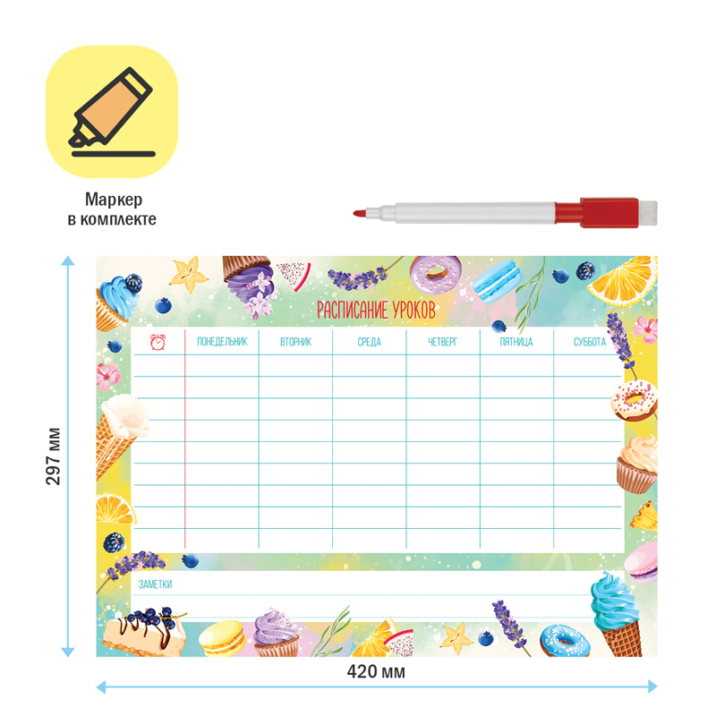 Магнитный планер для расписания уроков ArtSpace «Пиши-Стирай. Animals» – отличный помощник в планировании школьного дня. Планер формата А3 выполнен из картона плотностью 200 г/м2 с ламинацией и магнитного винила. Размер магнитного расписания – 297*420 мм. В комплекте прилагается маркер на магните со стирателем, которым очень удобно корректировать записи и крепить его к любой металлической поверхности (например, к холодильнику). Расписание рассчитано на 6-дневную рабочую неделю, по 7 уроков в день. Милый дизайн особенно понравится девочкам.