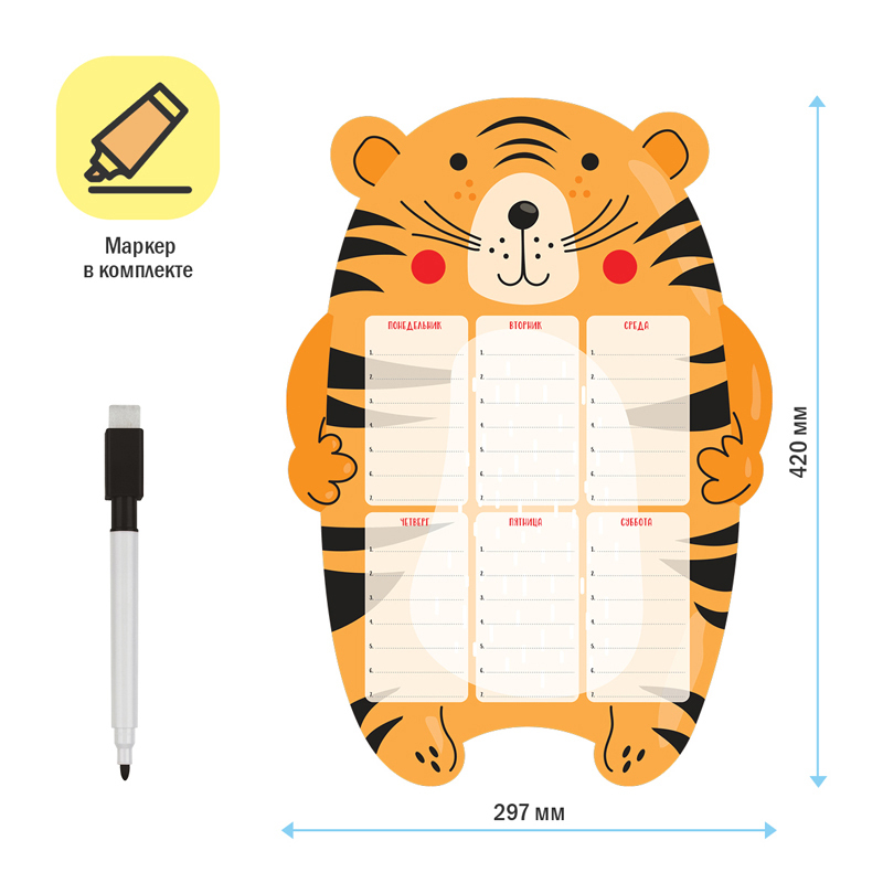 Магнитный планер для расписания уроков ArtSpace «Пиши-Стирай.Tiger» – отличный помощник в планировании школьного дня. Планер формата А3 выполнен из картона плотностью 200 г/м2 с ламинацией и магнитного винила. Размер магнитного расписания – 297*420 мм. В комплекте прилагается маркер на магните со стирателем, которым очень удобно корректировать записи и крепить его к любой металлической поверхности (например, к холодильнику). Расписание рассчитано на 6-дневную рабочую неделю, по 7 уроков в день. Универсальный оригинальный дизайн понравится мальчикам и девочкам.