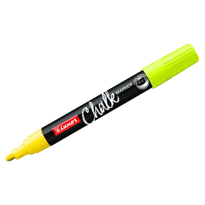Меловой маркер Luxor "Chalk Marker" на водной основе подходит для нанесения надписей на любой тип поверхностей: стекло, доска ( магнитная, для меню), зеркало, кафель, а также других типов поверхностей. Чернила на водной основе быстро высыхают и стираются сухой тканью. Перед применением маркер необходимо несколько раз встряхнуть , снять колпачок, вертикально поставить на любую поверхность и надавить несколько раз на наконечник, чтобы его заполнили чернила. Когда пишущий узел будет полностью окрашен пигментом, можно приступать к работе. Диаметр пишущего узла - 1мм. Цвет чернил - желтый.