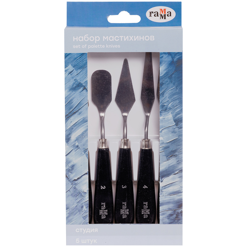 5 кованых мастихинов для художественных работ масляными и акриловыми красками. Упругое лезвие из нержавеющей стали, гладкая плоская ручка из натурального бука, удобная коробка для хранения.