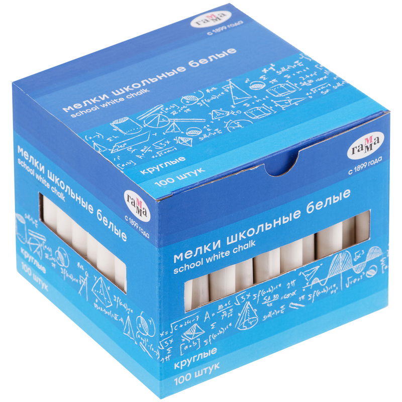 Круглый школьный белый мягкий мел ГАММА подходит для письма или рисования на школьной доске и любой шероховатой поверхности. Длина мелка — 8 см. В наборе 100 мелков.