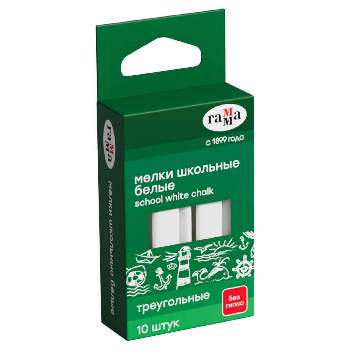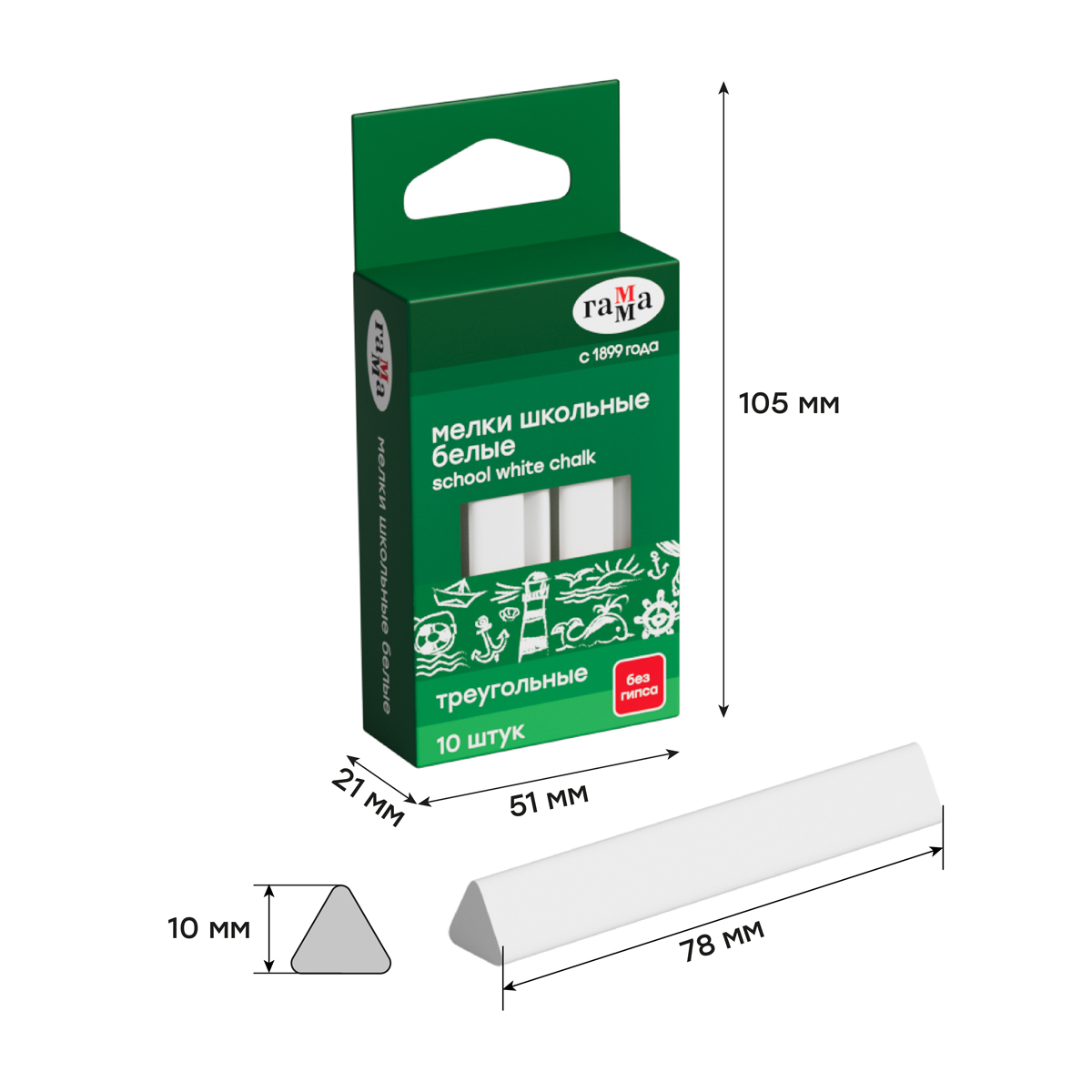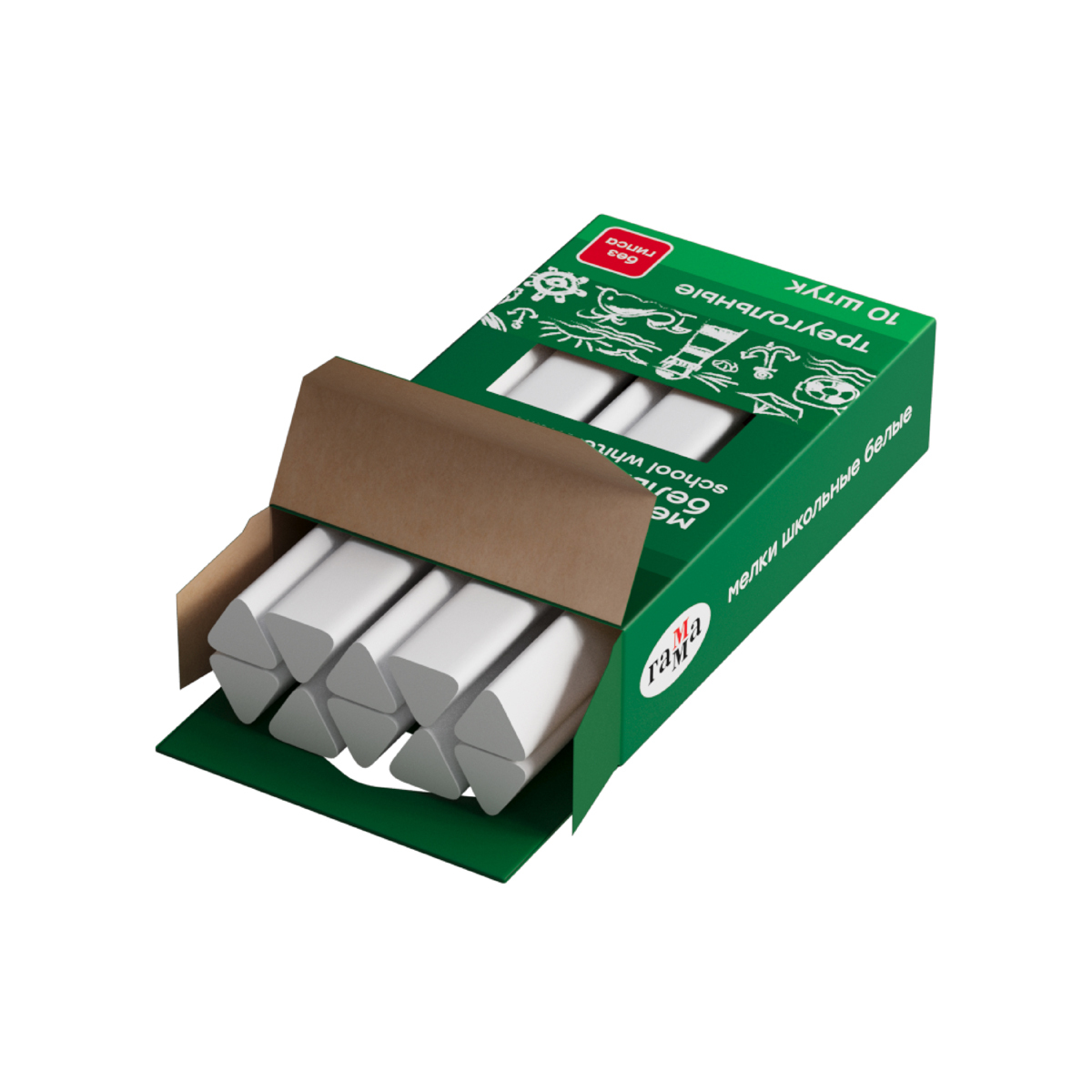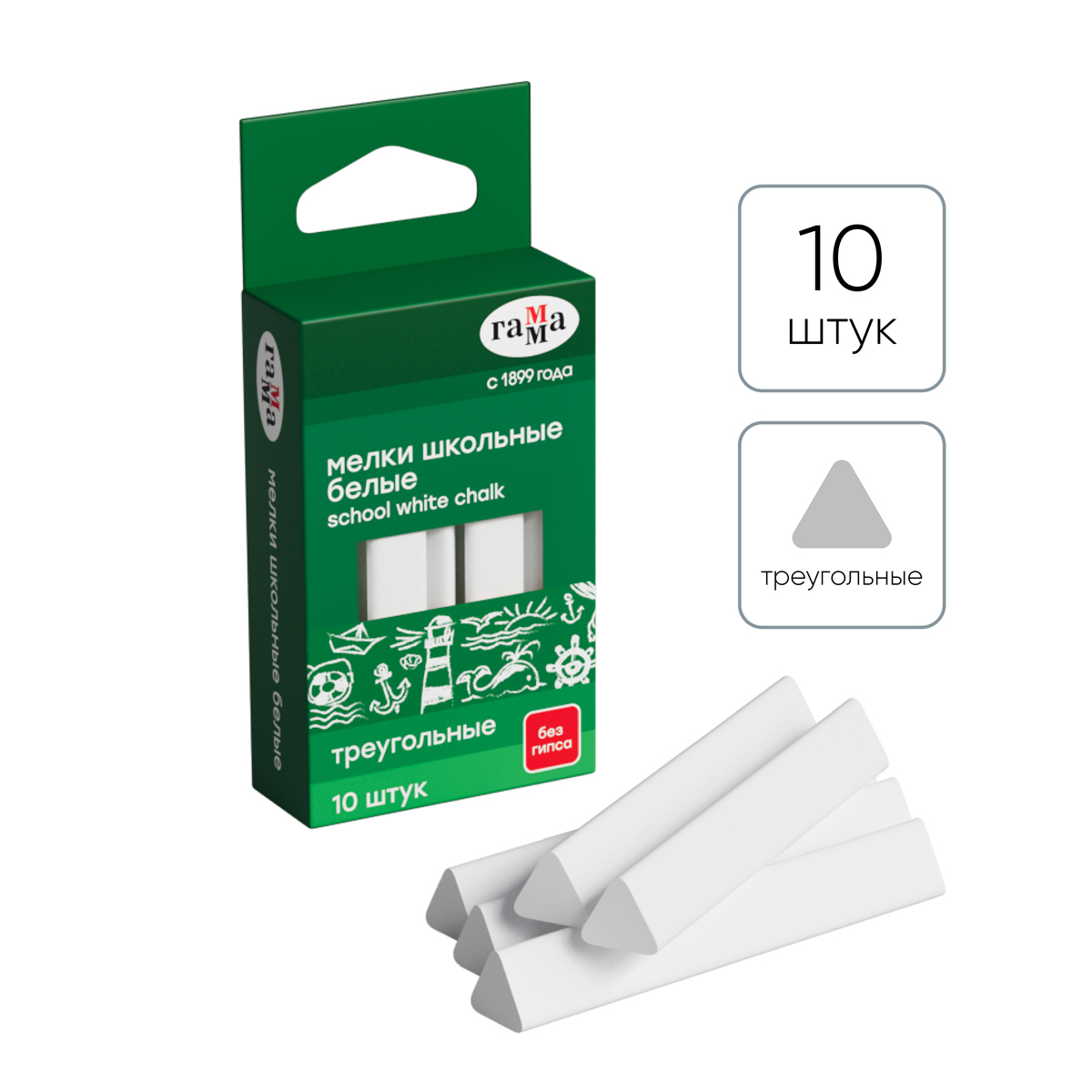 Набор из 10 треугольных школьных белых мелков ГАММА для классных и аудиторных досок, а также для рисования на асфальте. В упаковке 10 штук.