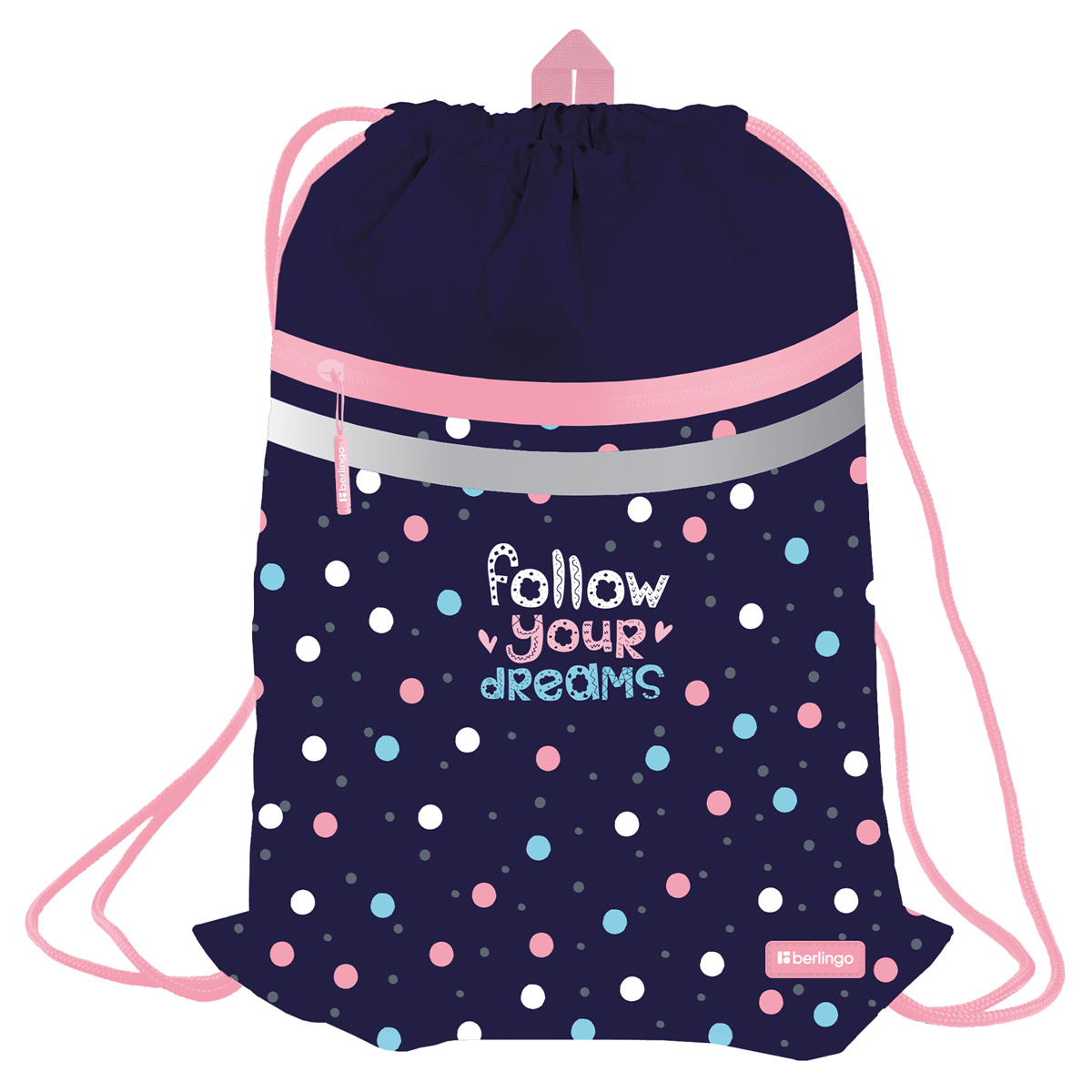 Вместительный мешок для обуви Berlingo оснащён прочными шнурками, светоотражающей полосой, вентиляционной сеточкой, передним карманом на молнии и петлей для подвешивания, а также имеет бирку для подписи имени, класса и телефона. Размер изделия 340*460 мм. Модель изготовлена из плотного полиэстера. Световозвращающие элементы обезопасят ребенка в тёмное время суток. Мешок идеален как для зимней обуви, так и для спортивной экипировки. Индивидуальная упаковка - пакет.