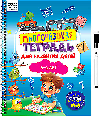 Многоразовая тетрадь для развития детей ТРИ СОВЫ «5-6 лет» формата А4 (228*296 мм) – идеальный помощник в развитии ребёнка. В ней представлены 30 ламинированных страниц с яркими иллюстрациями и заданиями. Большое количество увлекательных упражнений поможет с интересом и пользой организовать досуг малыша. Задания ориентированы на тренировку внимания, развития памяти, мышления, воображения и логики. Кроме того, занятия будут способствовать развитию моторики и навыков письма. К тетради прилагается маркер с губкой для стирания. Для усвоения материала упражнения можно выполнять многократно.