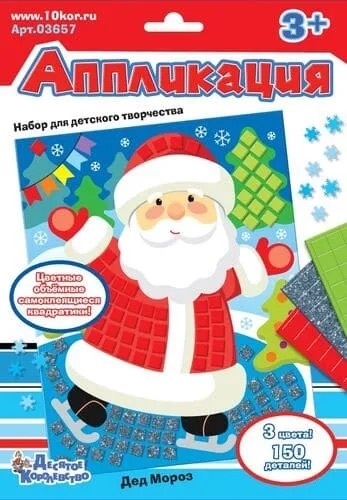 Дети, особенно девочки особенно любят заниматься украшательством. Так они познают окружающий мир, изучают цвета, постепенно приобщаются к творчеству.Детская самоклеящаяся аппликация с новогодними мотивами «Дед мороз» обязательно привлечет внимание малыша, а, чтобы она стала еще привлекательней, придется приложить старание и усидчивость при наклейке квадратиков. Этот процесс превосходно разовьет моторику непослушных пальчиков и стимулирует творческие наклонности.Занятия рекомендуем проводить с детьми от 3 лет.Порядок работы:1. Подберите квадратик, выбранного по изображению на рисунке, цвету.2. Отделите самоклеящийся квадратик от блока.3. Приклейте квадратик на картонную основу, на соответствующее его цвету место.Состав набора:- картонная основа (20х16 см) с напечатанным цветным рисунком – 1 шт;- самоклеящиеся квадратики (7х7х2 мм) 3 цвета – 150 шт.