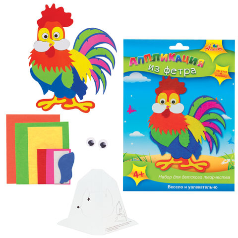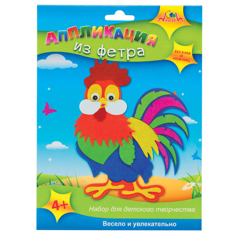 Набор содержит цветную картонную основу, вырубленную по контуру поделки, вырубленные элементы из самоклеящегося фетра, глазки, картонную подставку. Чтобы сделать аппликацию, необходимо отделить фетр от защитного слоя и приклеить к основе. Для объема элементы наклеиваются друг на друга слой за слоем. Инструкция - картинка на упаковке. Упаковка - полибег с европодвесом 180х230 мм. Готовая поделка 220х170 мм. В ассортименте. Возраст 4+.
