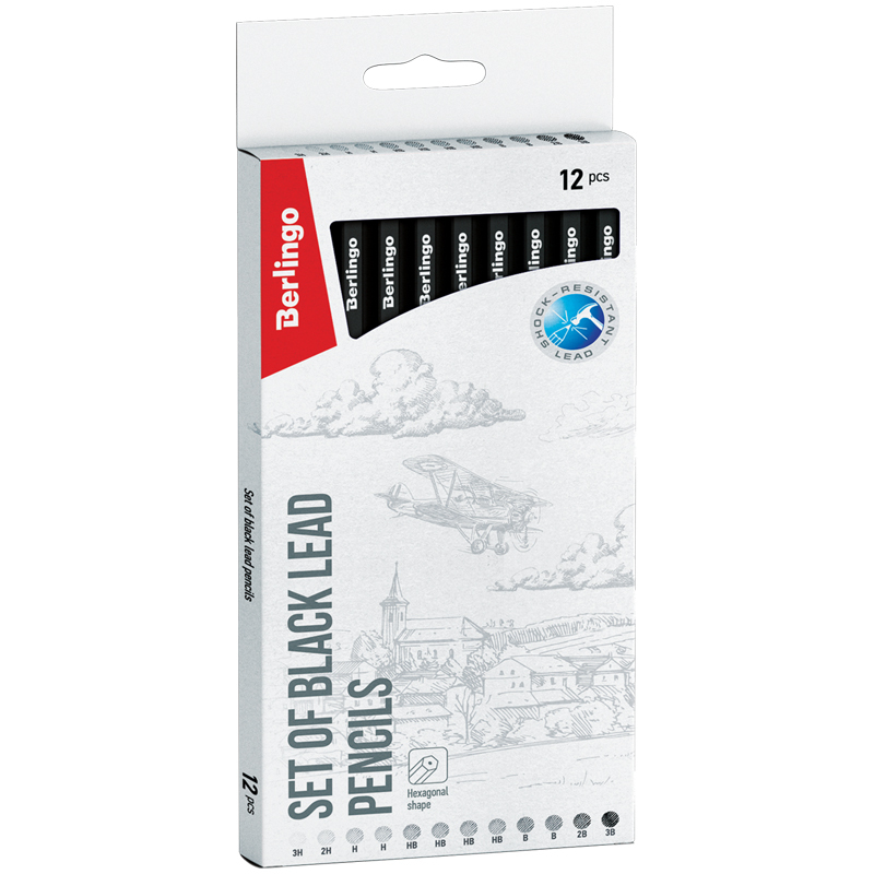 Набор из 12 чернографитных карандашей из липы, с заточкой разной твердости. Подходит для черчения и рисования. Диаметр стержня 2мм, твердость 3H-3B, шестигранной формы, с логотипом на корпусе. Трехцветная окраска корпуса. Упаковка в картонную коробку с европодвесом