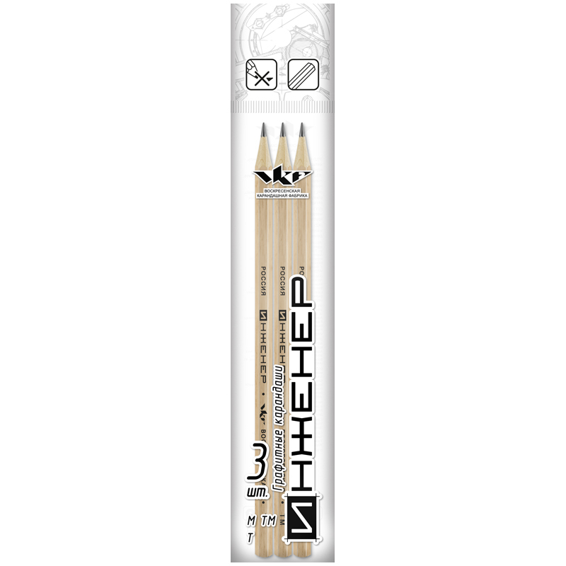 Предназначен для графических работ любой сложности. Изготовлен из сырья и материалов природного происхождения и качественной химически необработанной древесины липы, выращенной в экологически чистых районах России. Проклейка стержня осуществлена по специальной технологии, которая увеличивает прочность и надежность заклейки стержня в карандаше, предохраняет стержень от повреждений при падении, ударе и намокании, не изменяет цвет, упругость, прочность и чиночные свойства древесины в местах склейки. В наборе карандаши трех разлиных твердостей: Т, ТМ и М