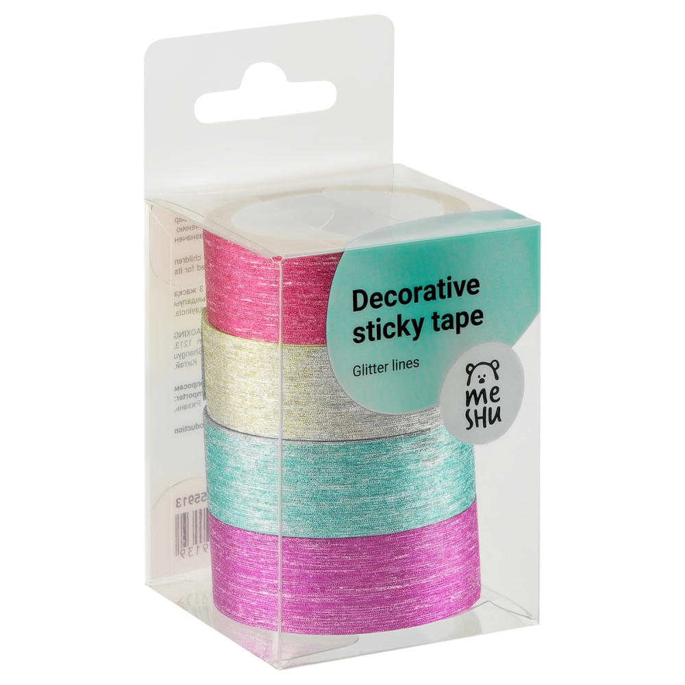 Декоративные клейкие ленты MESHU "Glitter lines" предназначены для упаковки подарков, оформления поделок и скрапбукинга. В набор входят 4 изделия в едином стиле. Длина намотки – 3 000 м. Открытки, альбомы, ежедневники, подставки, цветочные горшки, рамки и многое другое может преобразиться с бумажными мерцающими лентами MESHU. Качественная клеевая основа позволит надёжно зафиксировать декор.
