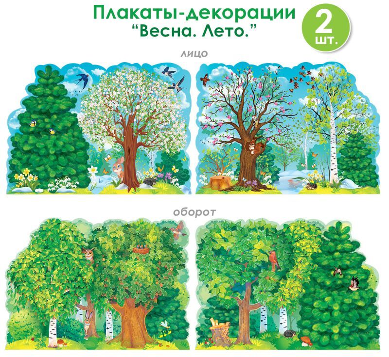 В комплекте – два двусторонних плаката: "Лето" и "Весна". С одной стороны – многообразие весенней природы, с другой стороны – настоящее лето. Матовая бумага, яркая печать, красочный дизайн. С помощью декораций можно воссоздать лес – для разнообразия на плакатах представлены и хвойные, и лиственные деревья: береза, ель, дуб и др. На плакатах можно увидеть яркие знаки весны: первые проталины, нежные листья, цветущие деревья, прилет птиц, и летние особенности: сочное буйство зелени, грибы, лесных персонажей. Полное погружение в атмосферу! Плакаты-декорации сделаны из бумаги, что позволяет размещать их на стенах, на шторах, на других поверхностях с помощью любых креплений.