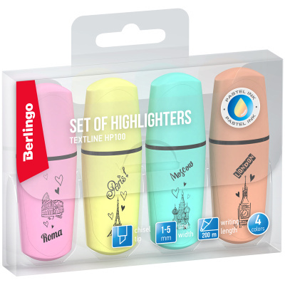Набор текстовыделителей "Berlingo", 4 цвета,предназначены для маркировки текста на всех типах бумаги. Мини-текстовыделители с пастельными чернилами на водной основе. Изготовлены в компактных пластиковых корпусах без клипов с изящными рисунками на корпусе в цвет чернил. Длина непрерывной линии письма до 200 метров. Толщина линии письма от 1 до 5 мм. Упакованы в PET пенал с европодвесом
