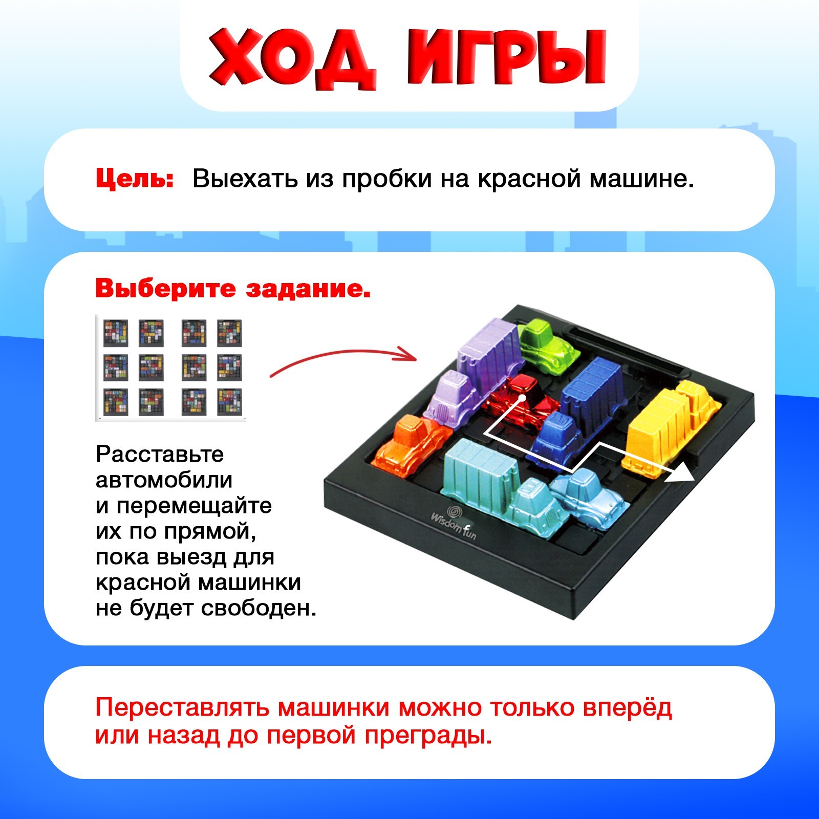Выберите картинку-задание из книжечки и расставьте машинки по игровому полю так, как они расставлены на картинке. Далее перемещайте автомобили на парковке по прямой. Переставлять их можно только вперёд или назад до первой преграды. Как только выезд для красной машинки свободен – задание считается выполненным. Красная машинка должна выехать через выход с парковки на правой стороне игрового поля.