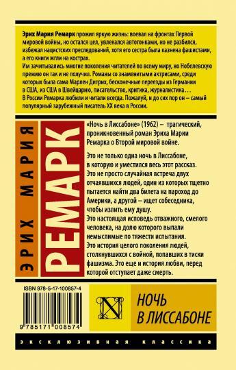 "Ночь в Лиссабоне" (1962) — трагический, проникновенный роман Эриха Марии Ремарка о Второй мировой войне.Это не только одна ночь в Лиссабоне, в которую и уместился весь этот рассказ. Это не просто случайная встреча двух отчаявшихся людей, один из которых тщетно пытается найти два билета на пароход до Америки, а другой — ищет собеседника, чтобы излить ему душу. Это настоящая исповедь отважного, смелого человека, на долю которого выпали немыслимые по тяжести испытания. Это история целого поколения людей, столкнувшихся с войной, попавших в тиски фашизма. Это еще и история любви, перед которой отступает даже смерть.