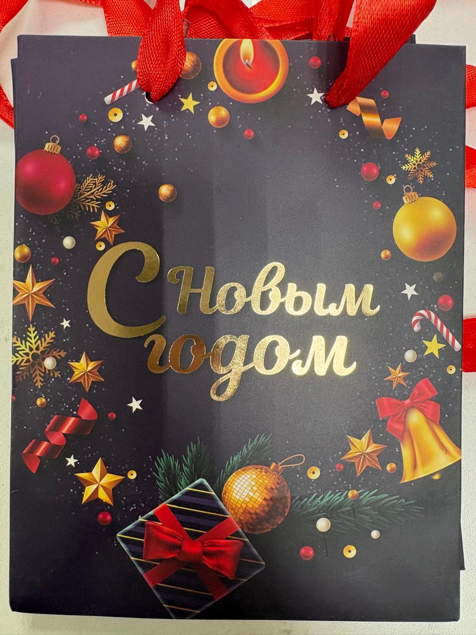 Подарочный пакет, как и все виды подарочной упаковки, способен придать особый статус подарку, также он является достаточно практичным изделием, которое может использоваться в повседневной жизни. Изготовлен из ламинированного мелованного картона с ленточными ручками из полиэстера. Размер – 11x6x15 см. Пакет выполнен в чёрном, красном, золотистом цветах с изображением праздничных новогодних атрибутов. С лицевой стороны пакета некоторые детали покрыты тиснением золотистой фольгой.