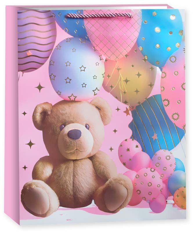 Пакет подарочный, Мишка с шариками, Дизайн №1, Металлик, 40*31*12 см, 1 шт.