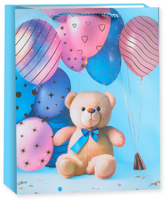 Пакет подарочный, Мишка с шариками, Дизайн №4, Металлик, 24*18*8,5 см, 1 шт.