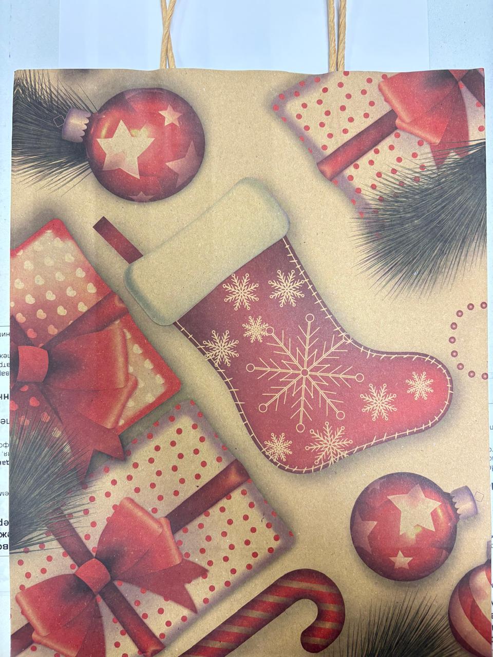 Подарочный пакет, как и все виды подарочной упаковки, способен придать особый статус подарку. Также он является достаточно практичным изделием, которое может использоваться в повседневной жизни. Набор подарочных пакетов изготовлен из крафт-бумаги с бумажными ручками. Размер – 26x13x32 см. Пакет выполнен с изображением новогодних атрибутов.