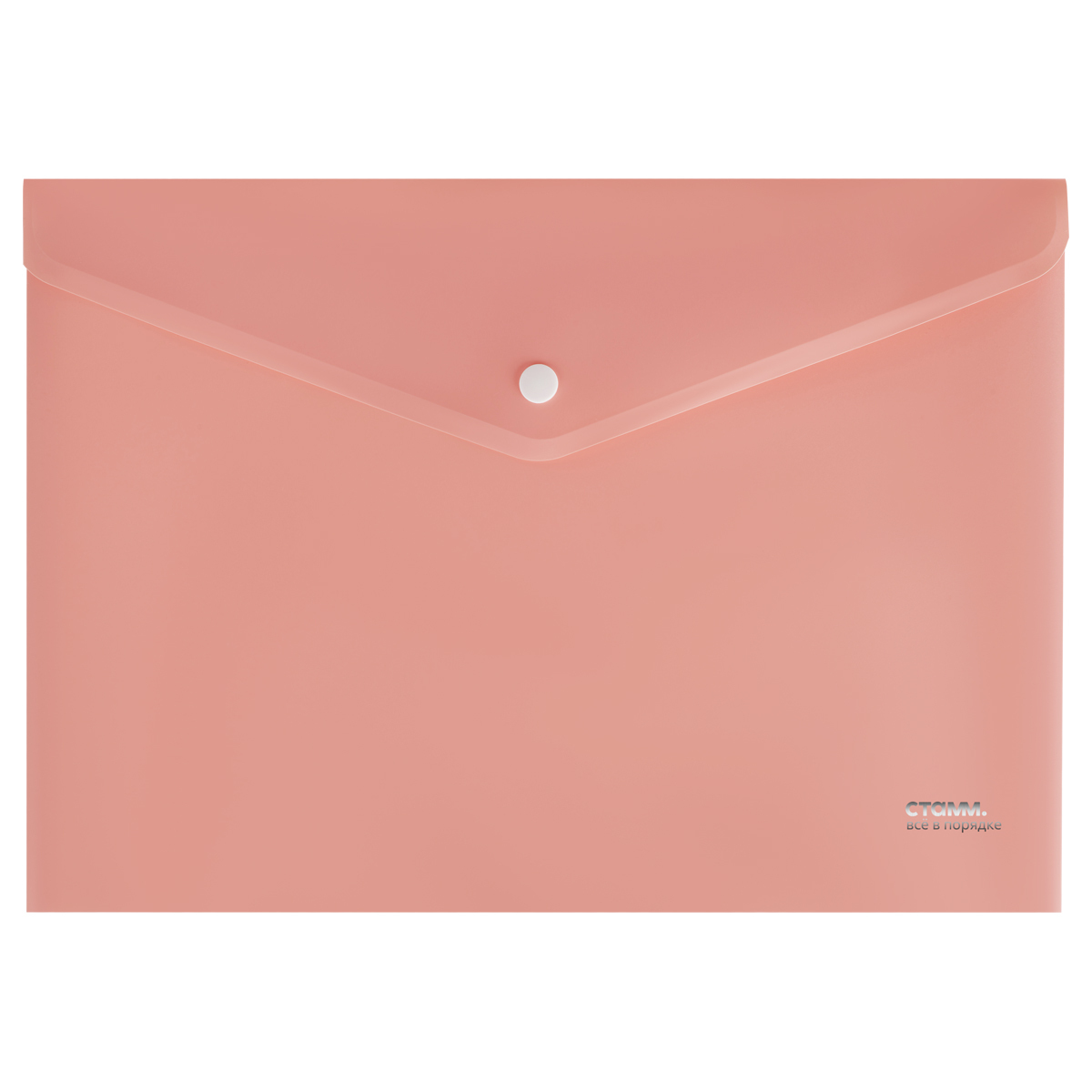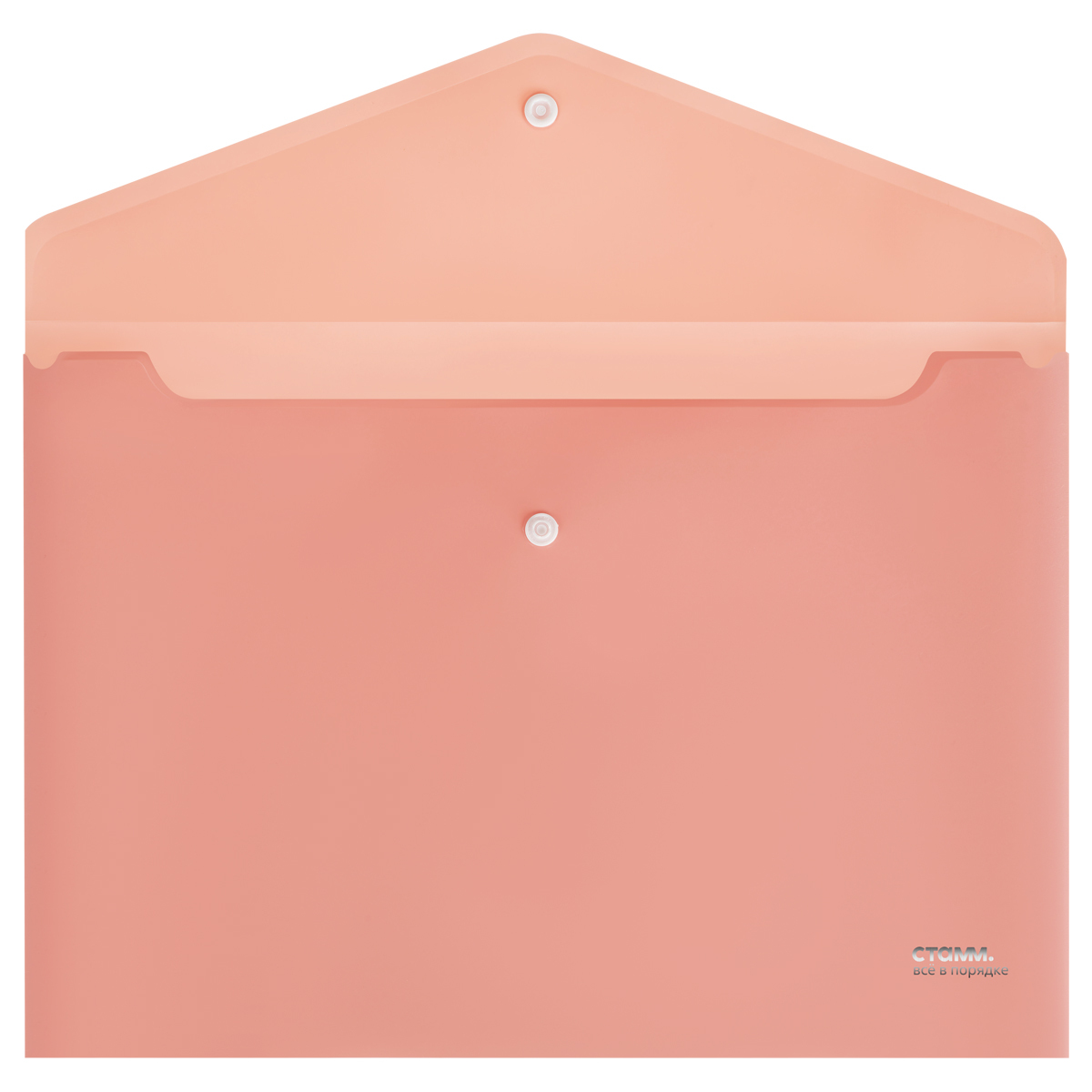 Папка-конверт на кнопке «СТАММ» серии «Акцент» надёжно защищает документы от влаги и пыли. Горизонтальное изделие формата А4 вмещает до 100 листов. Изготовлена из качественного полипропилена плотностью 180 мкм с матовой текстурой. Размер папки составляет 330*235 мм. Изделие кораллового цвета плотно закрывается на кнопку.