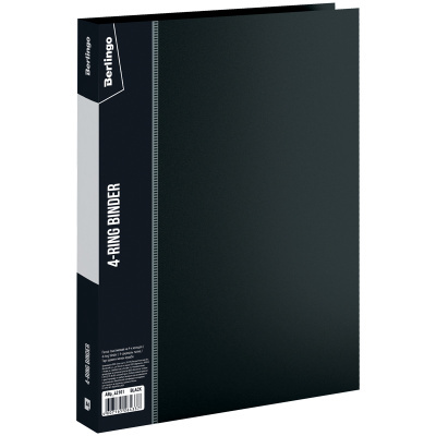 Папка на 4 кольцах Berlingo серии Standard размером 305*250*25 мм изготовлена из плотного пластика толщиной 0,7 мм с текстурой «песок». Вместимость папки – 120 листов, ширина корешка – 25 мм. Кольцевой механизм с 4 кольцами диаметром 17 мм надежно держит перфорированные документы и документы, помещенные в файлы-вкладыши. На корешке и внутренней стороне папки имеется карман. Папка формата А4 – это функциональный аксессуар для работы и учебы, который выполнен в классическом черном цвете и предназначен для транспортировки, упорядочивания и хранения бумаг. Индивидуальная упаковка в пакет.
