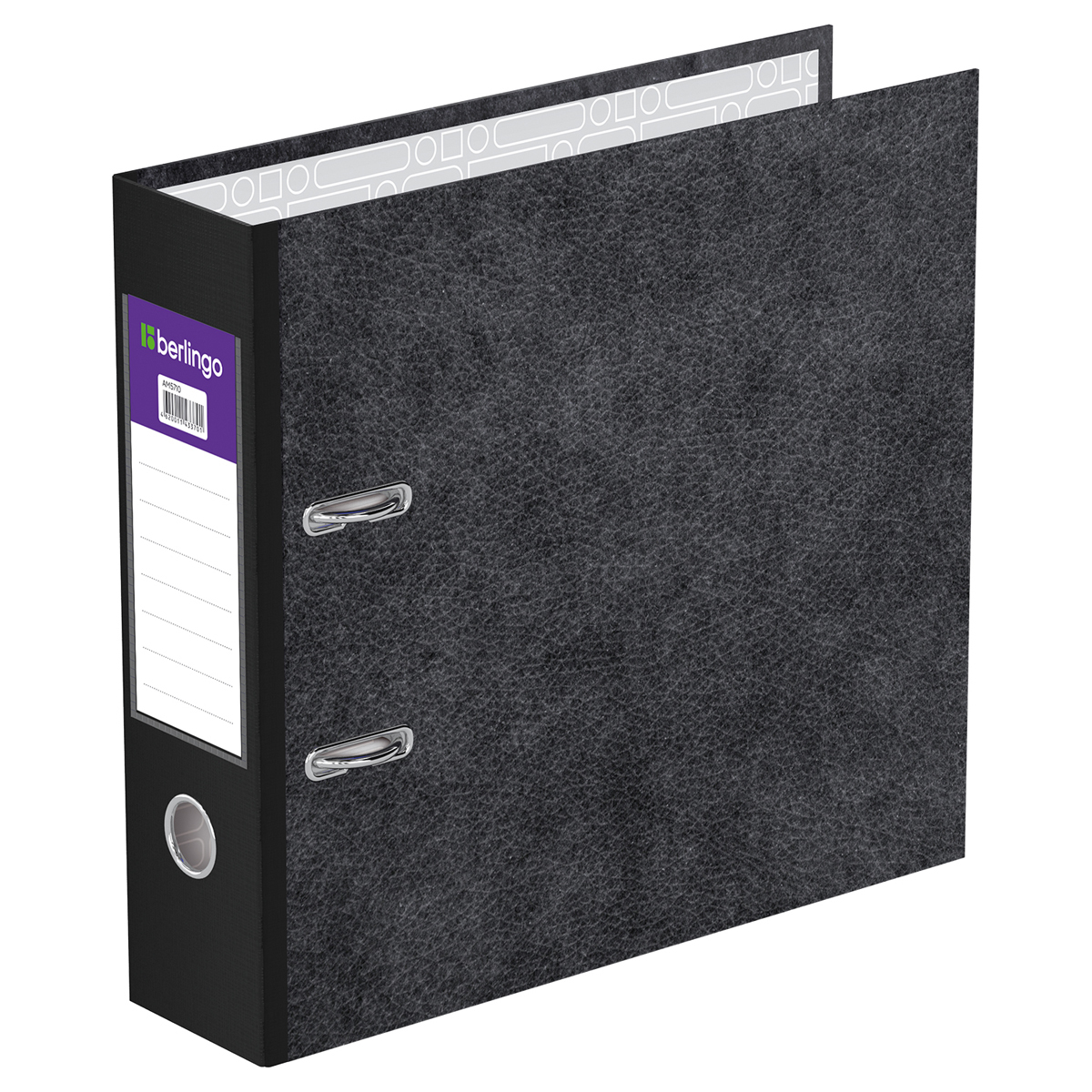 Папка–регистратор Berlingo серии Standard размером А5 (230*220*70 мм) с обложкой из жесткого износостойкого картона с покрытием из специальной ламинированной бумаги. Вместимость папки – 550 листов, ширина корешка – 70 мм. Цвет – черный мрамор. Конструкция разработана с учетом всех особенностей эксплуатации. Папка выгодно отличается надежным арочным механизмом из качественного металла, наличием кармана на корешке со сменным информационным ярлыком для маркировки, полем для записей на внутренней стороне обложки и отверстием для удобного снятия с полки. Папка предназначена для транспортировки, упорядочивания и хранения бумаг.