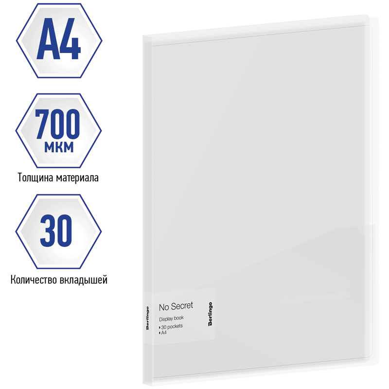 Папка Berlingo серии No Secret с 30 вкладышами формата А4 - отличный и стильный помощник для хранения документов с плотной обложкой с приятной софт-тач фактурой. Особенностью данной серии является прозрачная обложка. Толщина обложки - 700 мкм. Тип скрепления – термосварка. Ширина корешка - 17 мм. Папка изготовлена из высококачественного полипропилена с особой фактурой с эффектом софт-тач. Внутренняя сторона обложки оснащена плотным прозрачным карманом для удобного хранения мелочей: ручки, заметок, визиток, дисков, флешек и др. Папка выполнена в размере 310*233*17 мм. Папка имеет прозрачные фактурные листы-карманы увеличенной толщины 30 мкм, надёжно скреплённые сваркой. Вмещает до 100 бумажных листов. Индивидуальная упаковка в прозрачный пакет по форме. Папка оснащена съемным стикером с выходной информацией и штрих-кодом.