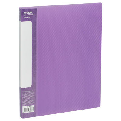 Папка с 30 вкладышами «СТАММ» серии «Кристалл» – отличный помощник для хранения бумаг формата А4. Изделие выполнено в полупрозрачном фиолетовом цвете. Внешняя сторона папки дополнена фактурным паттерном «Кристалл», сохраняющим внешний вид изделия от загрязнений и повреждений. Размер изделия составляет 235*310 мм. Ширина корешка – 17 мм. Тип скрепления – термосварка. Бумагам, вложенным в папку, не требуется перфорация дыроколом. На корешке папки есть удобный карман. Папка упакована в индивидуальный пакет. • Размер: 235*310 мм; • Толщина материала: 700 мкм; • Формат: А4; • Количество вкладышей: 30; • Цвет: фиолетовый; • Тип скрепления: термосварка; • Ширина корешка: 17 мм.