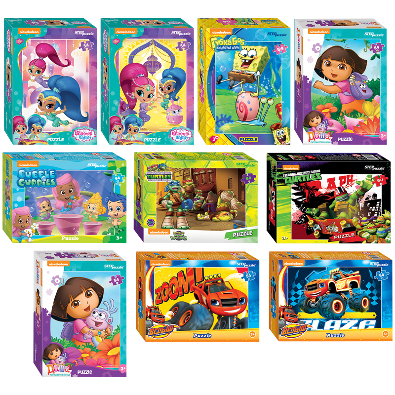 Пазл «Никелодеон» состоит из 54 деталей. На картинках пазлов изображены герои современных детских мультфильмов - Даша-путешественница, Губка Боб, Гуппи и Пузырики, Шиммер и Шайн, маленькие герои-черепашки, Вспыш и его друзья. Характеристики пазла: стандартные детали пазла (2 ? 1,8 см), размер собранного изображения — 18 ? 13,5 см, качественное яркое изображение, материал – картон, экологически чистые, нетоксичные материалы.
