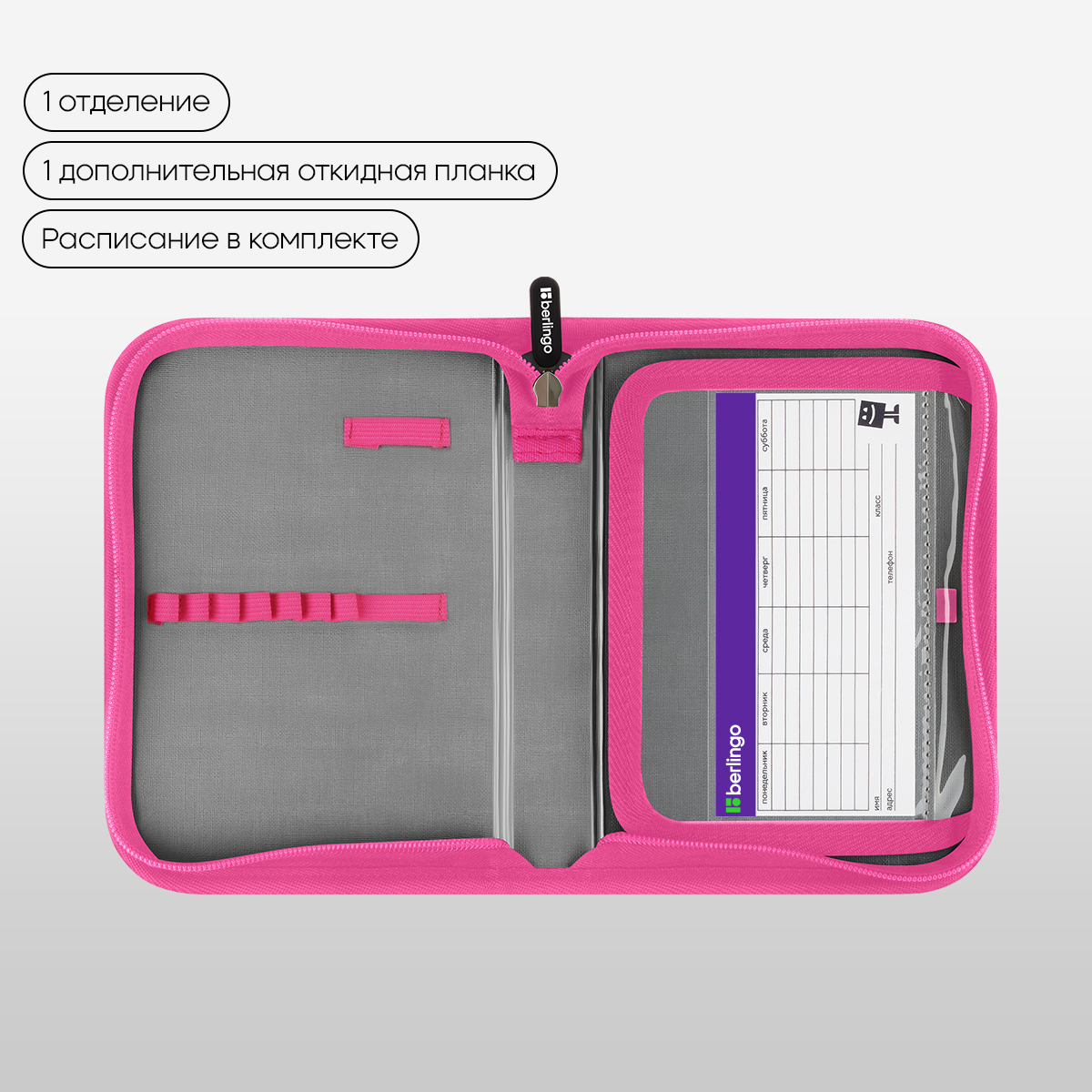 Каркасный пенал Berlingo помогает школьнику хранить канцелярские принадлежности в одном месте. Изделие размером 200*140*40 мм не занимает много места в рюкзаке. В одно отделение помещается 25 предметов. За счёт креплений-резиночек для канцтоваров внутри пенала легко поддерживать порядок. Одна откидная планка увеличивает вместимость изделия и позволяет всегда держать расписание уроков перед глазами. Благодаря крупному бегунку ребёнку удобно открывать пенал на молнии.