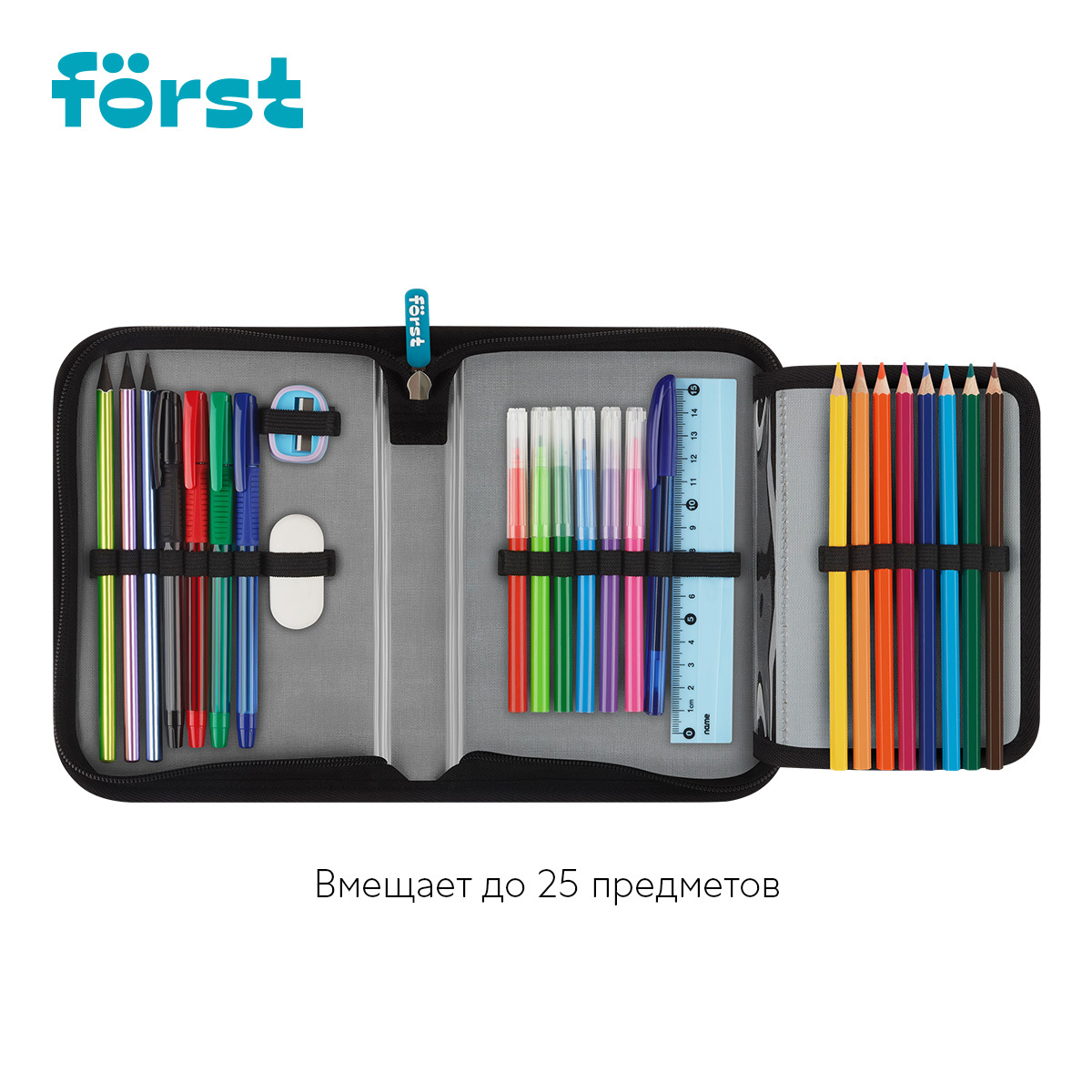 Каркасный пенал Först помогает школьнику хранить канцелярские принадлежности в одном месте. Изделие размером 200*140*40 мм не занимает много места в рюкзаке. В одно отделение помещается 25 предметов. За счёт креплений-резиночек для канцтоваров внутри пенала легко поддерживать порядок. Одна откидная планка увеличивает вместимость изделия и позволяет всегда держать расписание уроков перед глазами. Благодаря крупному резиновому бегунку ребёнку удобно открывать пенал на молнии.