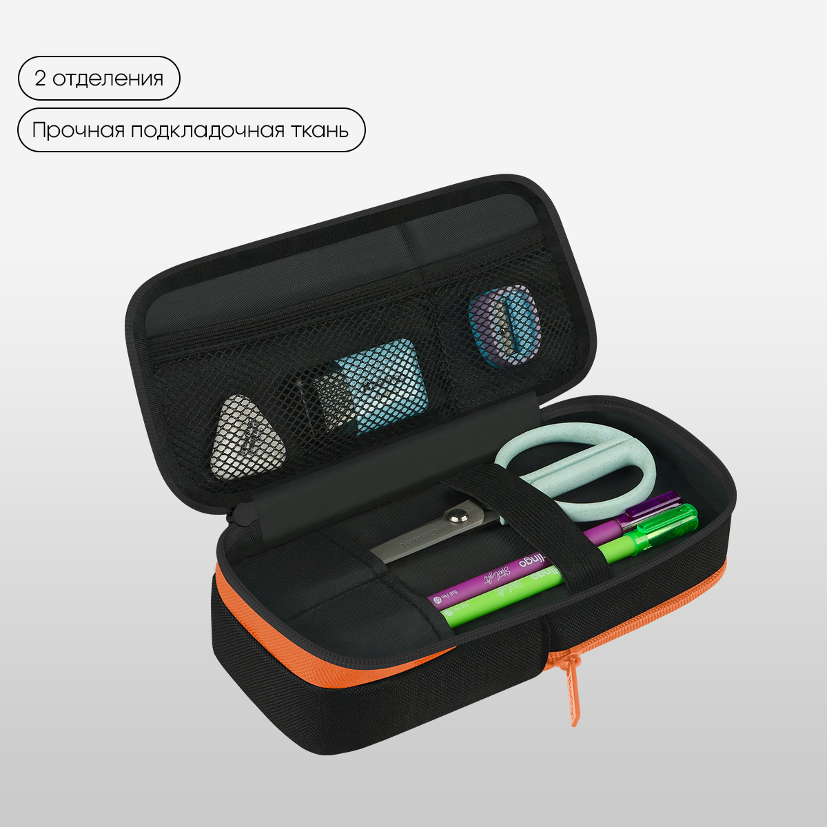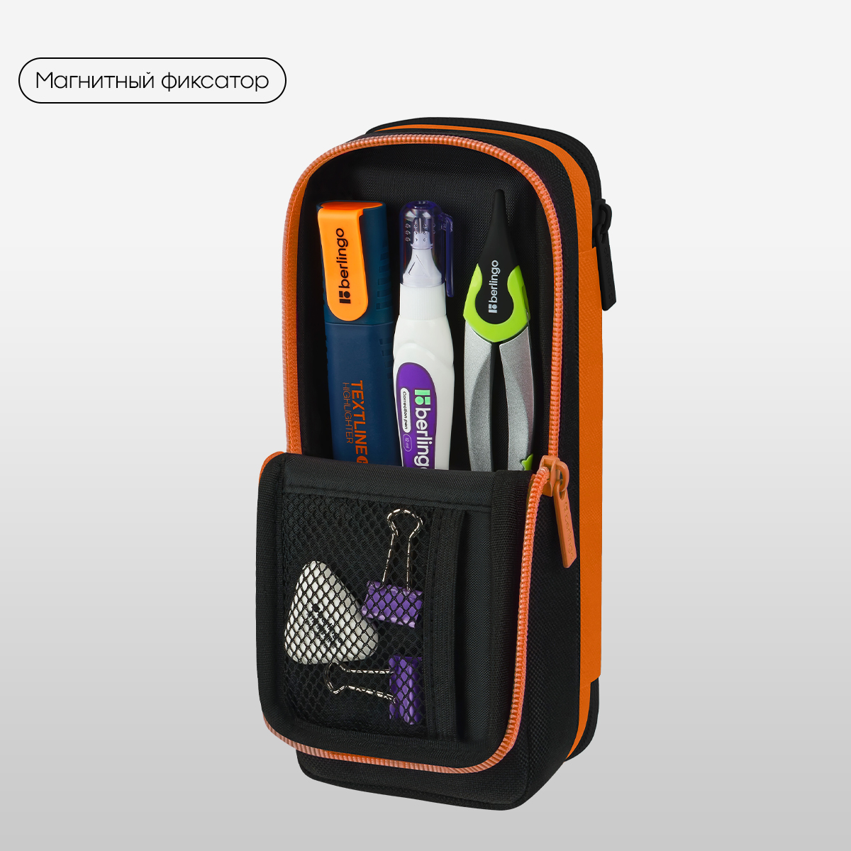 Пенал-футляр школьный мягкий Berlingo размером 205*80*55 мм имеет два отделения. Материал лицевой и внутренней поверхности – полиэстер. На откидной части есть небольшой кармашек для точилки и ластика. В ней также спрятан магнит для удобства использования в открытом виде. Во втором отделении находится специальный органайзер для хранения канцтоваров. Поставляется без наполнения. Индивидуальная упаковка - пакет.