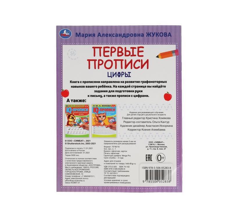Данные прописи разработаны Марией Александровной Жуковой - педагогом и логопедом с многолетним опытом работы. На страницах этой книжки ребёнка ожидают занимательные упражнения по её авторской методике, направленные на тренировку написания цифр. Благодаря компактным размерам прописи удобно брать с собой даже в поездки.