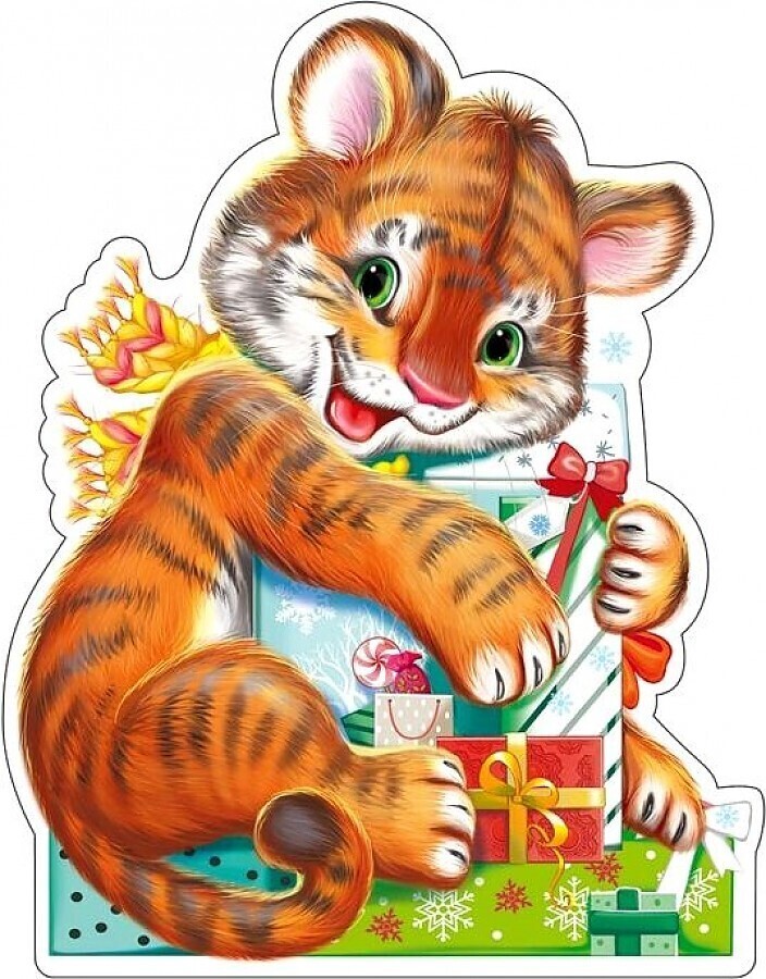 Плакат ФМ-13931сф Плакат вырубной А4. Тигренок с новогодними  подарками (блестки в лаке)