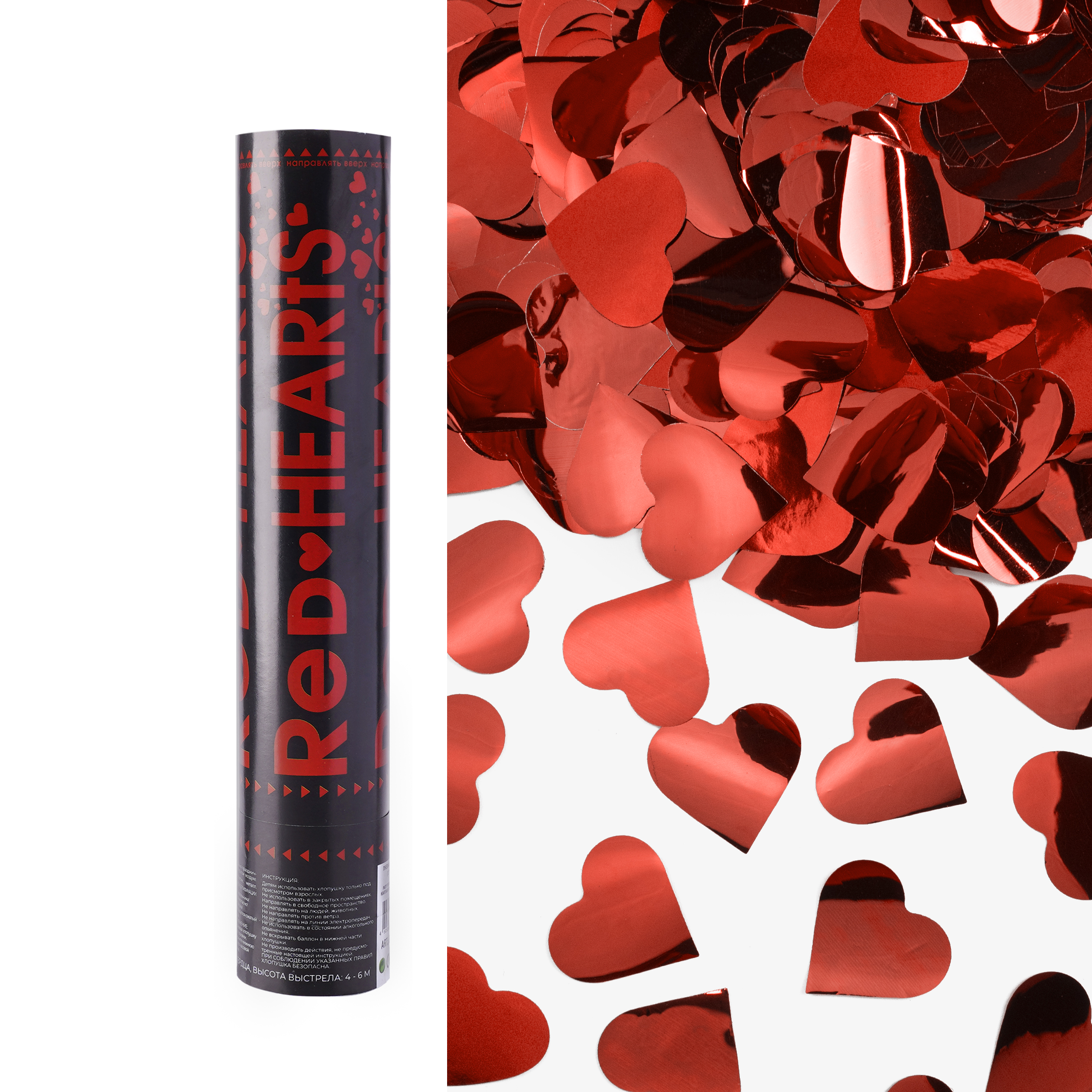 Пневмохлопушка (12/30 см), Романтика, Сердца фольга, Красный, Металлик, 1 шт.