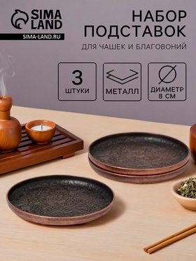 Изысканный набор из трех латунных подставок с азиатским орнаментом. Предназначены для использования во время чайной церемонии: для чашек, а также для благовоний, создавая атмосферу гармонии и умиротворения. Диаметр каждой подставки: 8 см.