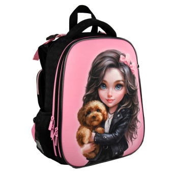 Ранец школьный Феникс+ арт.68240/ 4 БРЮНЕТКА С СОБАЧКОЙ (27х37х13 см, полиэстер, ЭВА-панель, сублимационная печать, шелкография в одну краску, 2 отделение (-я), молния, тип спинки: формоустойчивая жёсткая спинка из сетчатой ткани и поролона c дополнительной функцией регулировки лямочной конструкции под рост ребёнка, тип дна: с пластиковыми ножками, ПЭТ-пакет с ручкой)