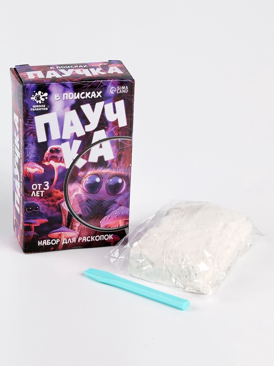 Набор для юных исследователей «В поисках паучка» — это увлекательная раскопка, которая познакомит ребёнка с миром палеонтологии. Внутри спрятан маленький сюрприз — фигурка паучка, которую нужно аккуратно извлечь, используя инструменты.